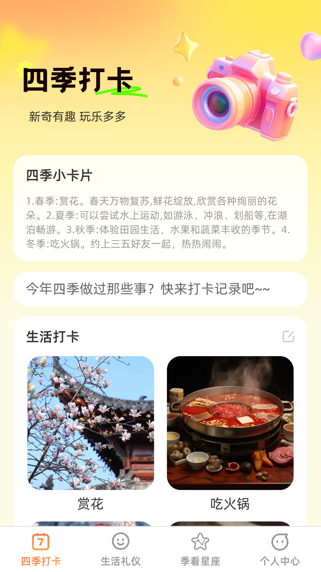【四季打卡】四季打卡的功能是为了给您记录和分享每个季节的美好瞬间。无论是春花绽放、夏日海滩、秋叶飘落还是冬雪纷飞,您可以拍摄照片、写下心情,记录下每个季节的做过的事情。