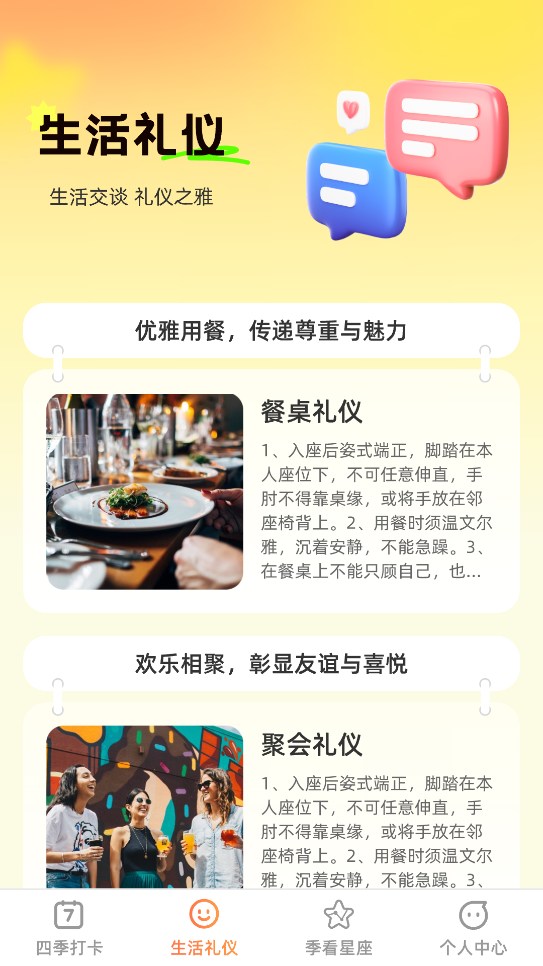 【社交礼仪】提供了生活礼仪功能,帮助您学习和了解各个场合下的生活礼仪。应用中提供了礼仪指南和建议,让您在各种场合中展现自信和优雅的生活风范。