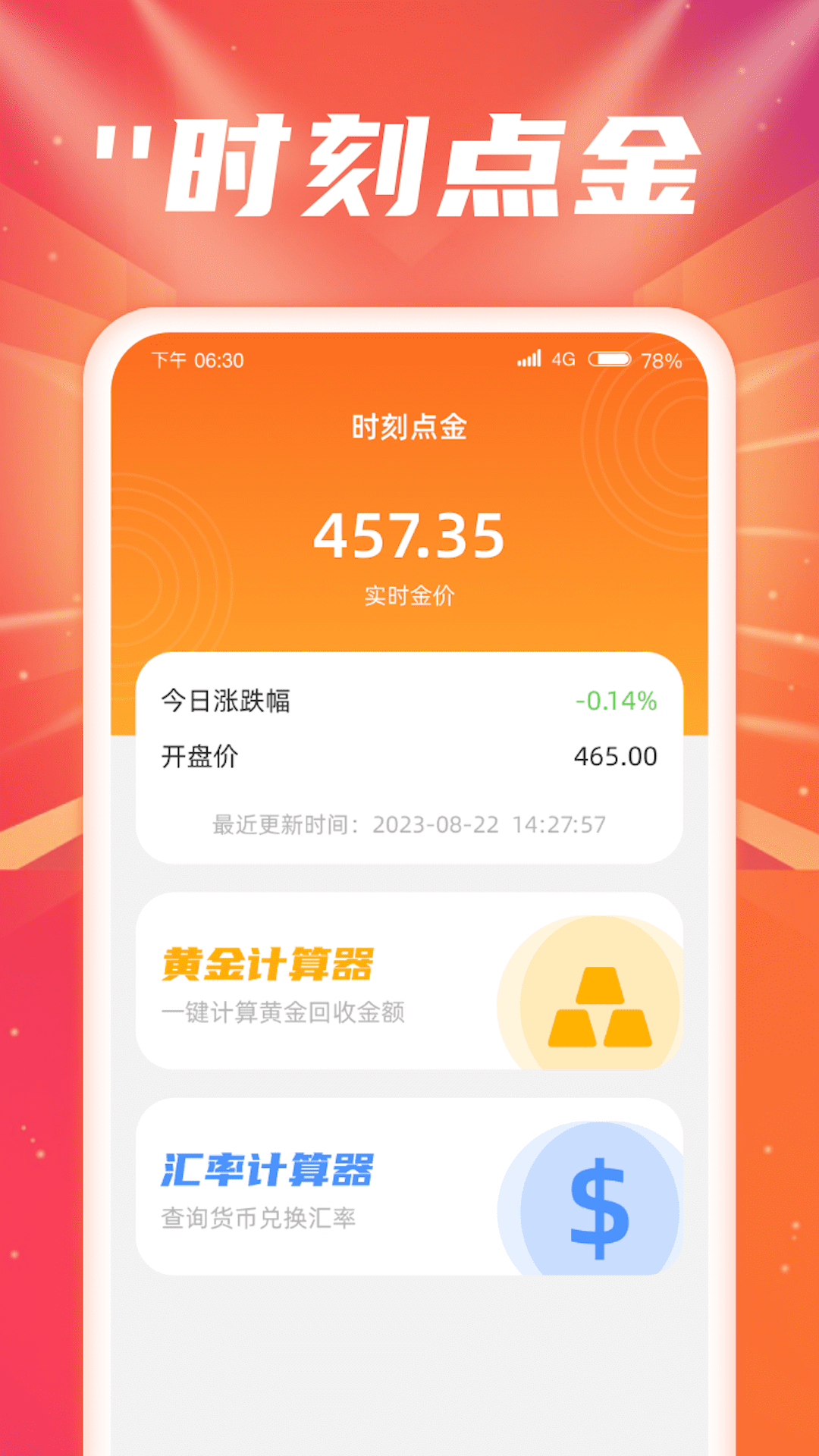 时刻点金是一款多功能的工具软件,涵盖黄金计算、货币汇率计算以及性格测试等功能。