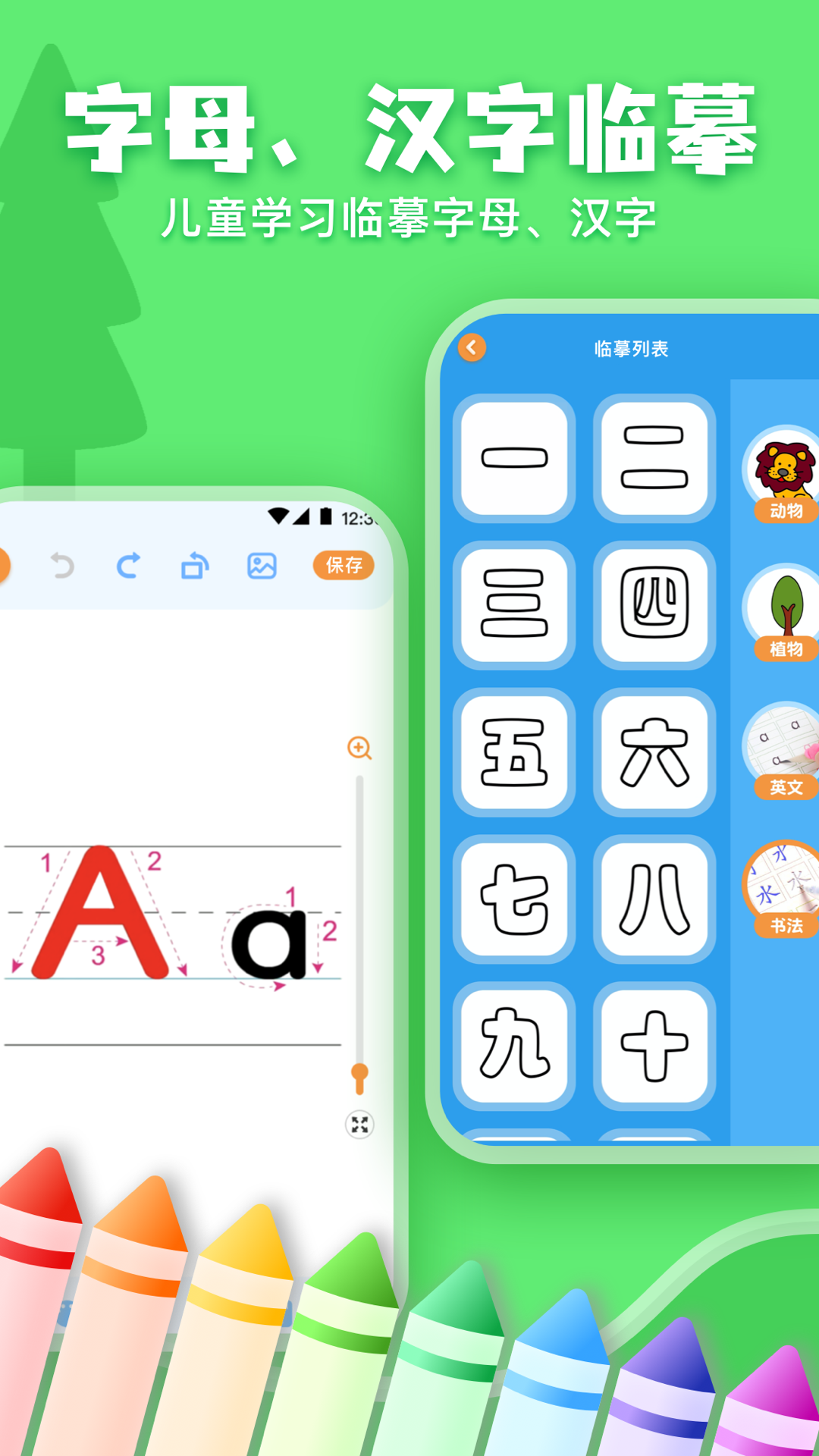 提供字母、汉字字帖、植物、动物的临摹内容,让孩子在画画的时候,轻松掌握简单的字母、汉字以及绘画技巧,是一个很不错的学习工具。