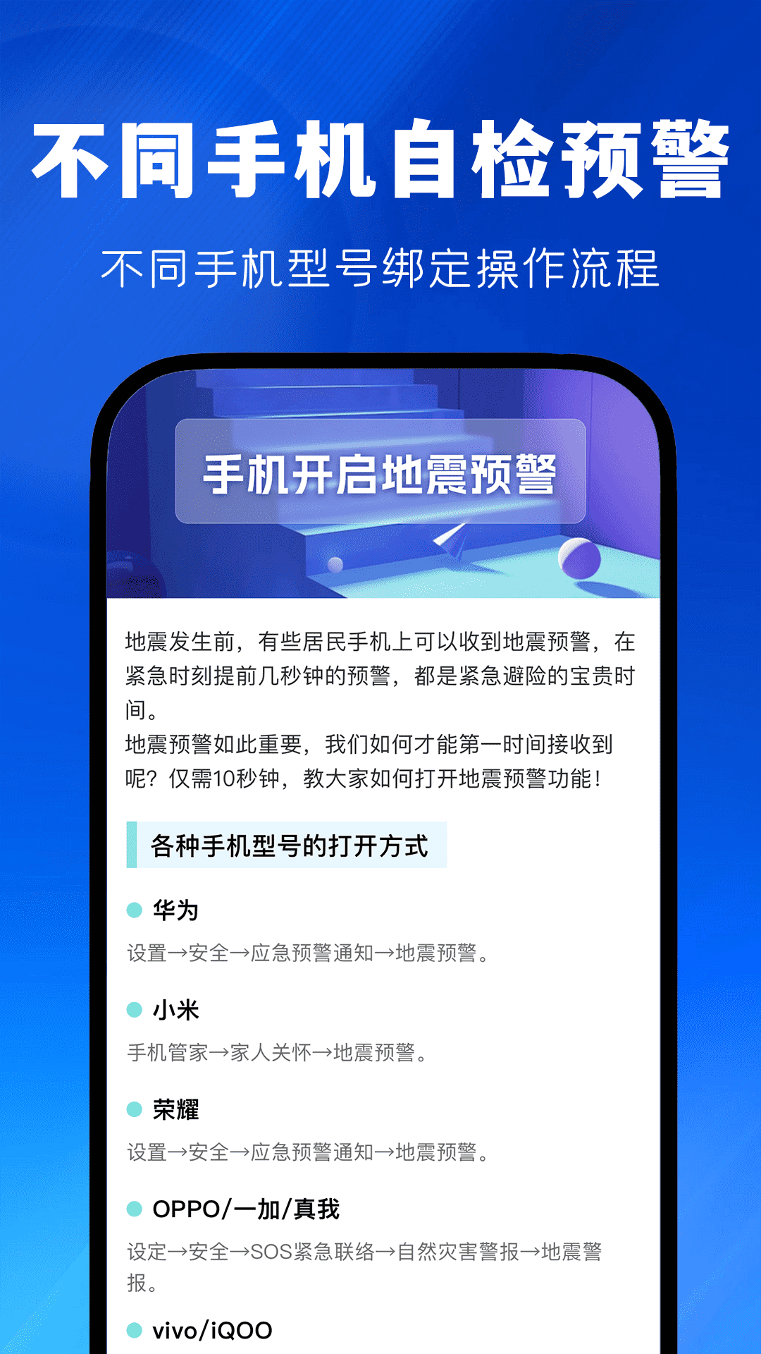 应用内包含了丰富的地震知识百科,涵盖地震成因、地震预警原理、防灾小知识等内容,提高您的地震科学素养。