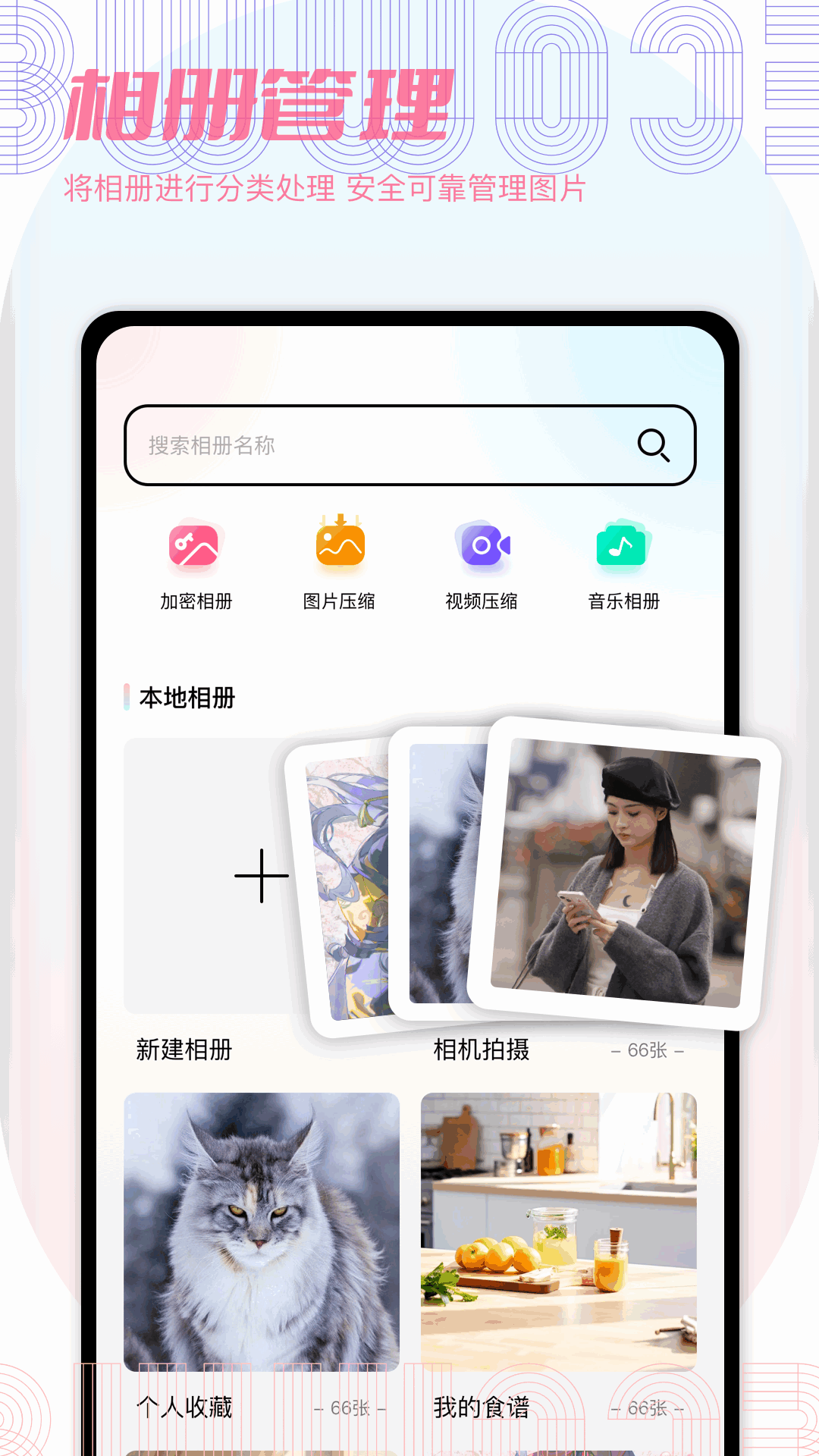 在这个APP里,你能够优雅地展示自己的壁纸照片,给人一种清爽又舒适的视觉感受;它采用加密手段来保护你的私密照片,让数据安全无忧;而且还提供丰富的素材,助力你更好地管理相册中的图片。