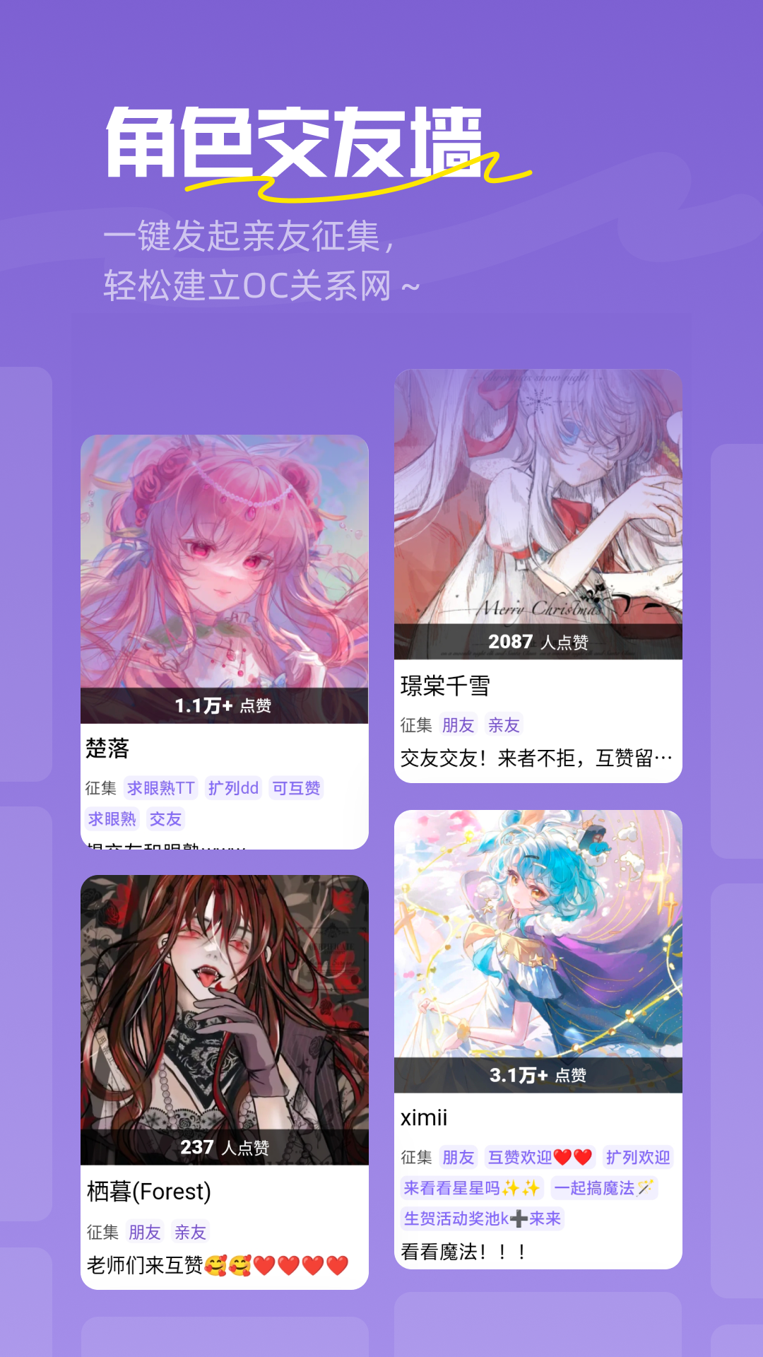 【更多爱好者交流互动】这是一个专门为二次元爱好者构建的交流社区,这里健康又有趣。你可以发布任何自己感兴趣的二次元内容,像是养OC的心得体会、OC的新稿件、世界观的创建过程,或者安利自己喜欢的画师之类的。在这些充满友善的交流互动当中,你能够找到更多和自己同频的亲友,为OC打造专属的关系网络,进而构建属于自己的“元宇宙”。