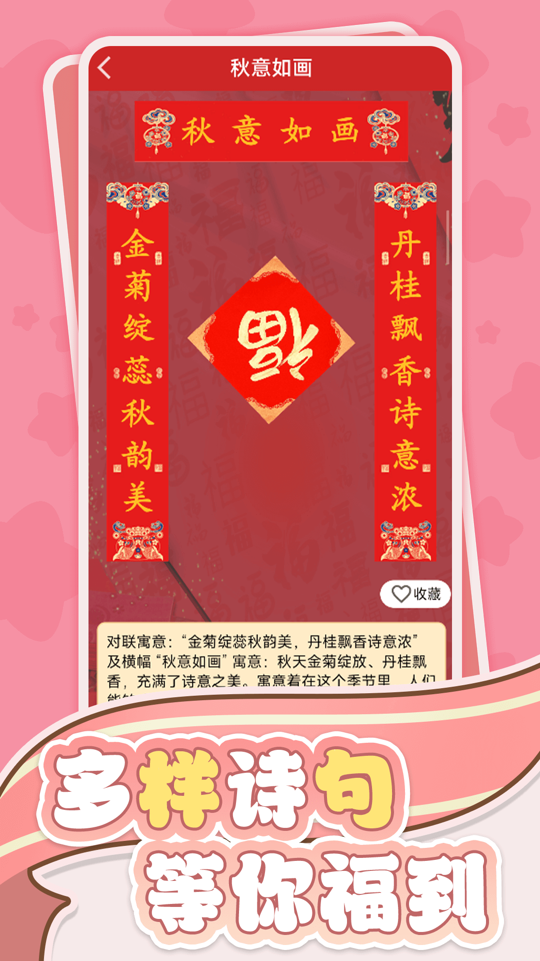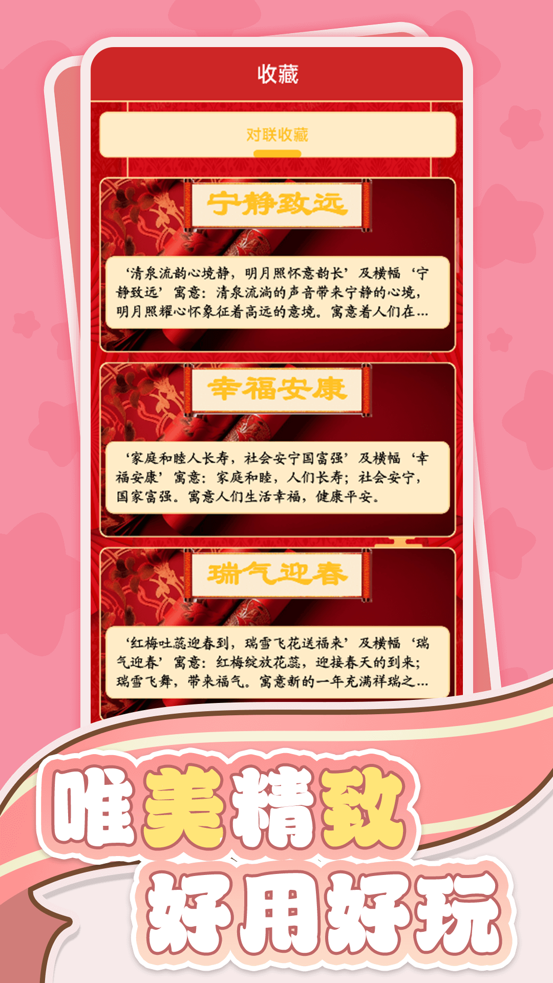 “恭喜发财” 是一款极具特色的应用,它为你提供丰富多样的常用对联,无论是传统佳节所需的春联,充满喜庆氛围,为新年增添浓郁的节日气息,还是庄重而美好的婚联,为新人送上真挚的祝福。这些春联不仅词句优美,而且寓意吉祥,为春节增添了浓厚的节日氛围。想象一下,在新年前夕,你打开这个应用,挑选出一副心仪的春联,亲手张贴在自家门口,那种喜悦与满足感不言而喻。同时,该应用还具备日历功能,让你随时查看日期,合理规划生活。有了 “恭喜发财” 应用,无论是筹备婚礼、迎接新春,还是日常查询日期,都能轻松搞定,无论你是对联爱好者,还是需要日历功能来管理生活的人,都能在这个应用中找到满足。它既可以作为学习传统文化的工具,又可以成为日常生活的得力助手,为你的生活带来更多便利与精彩。