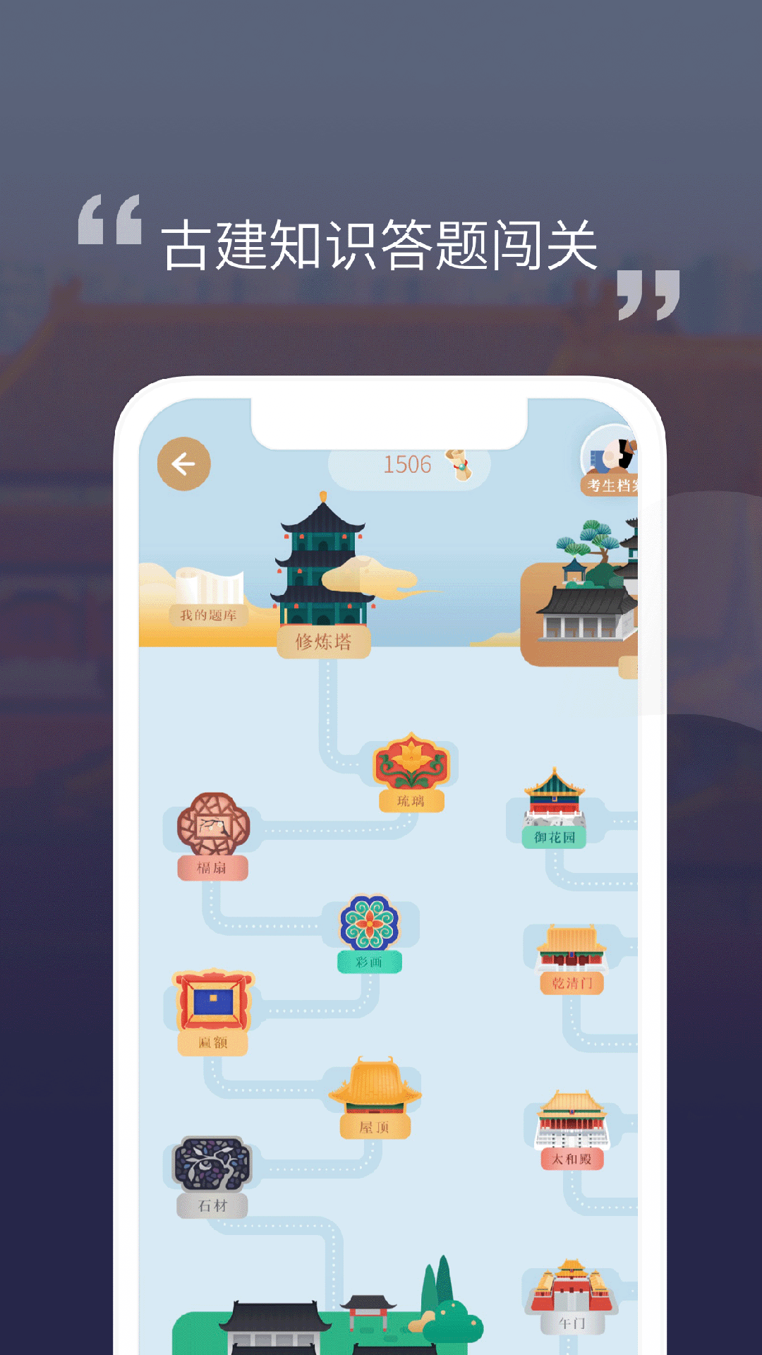 从“初出茅庐”起步,一路迈向“殿试夺魁”,这里设置了30个关卡,包含850多个有关古建筑的知识问答。您可以一边学习一边记录知识要点。每通过一个关卡就能收集成就徽章。当您顺利通过“殿试”后,就能够与其他玩家在同一平台展开竞技,比个高低。