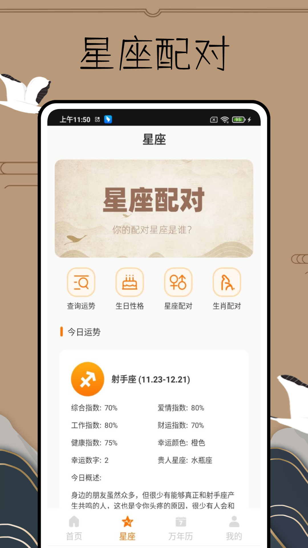 除了八字排盘功能之外,易简国学还为用户提供星座运势查询服务。在星座板块,用户能够轻松查询自己的运势、生日性格、星座配对以及生肖配对等信息。该应用运用先进的算法与丰富的星座知识,为用户呈现精准的星座运势分析内容。