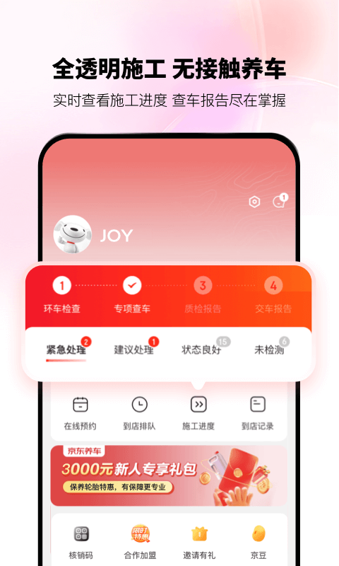 京东养车有着线上线下一体化的标准服务模式,到店履行服务的整个过程都是透明化的。车主在购买服务之后,可以通过APP预约到店时间,还能随时查看排队的进展情况。到达门店之后,能够在APP上查看车辆档案、环境检查等详细报告,报价完全透明,让车主养车的时候更加安心。