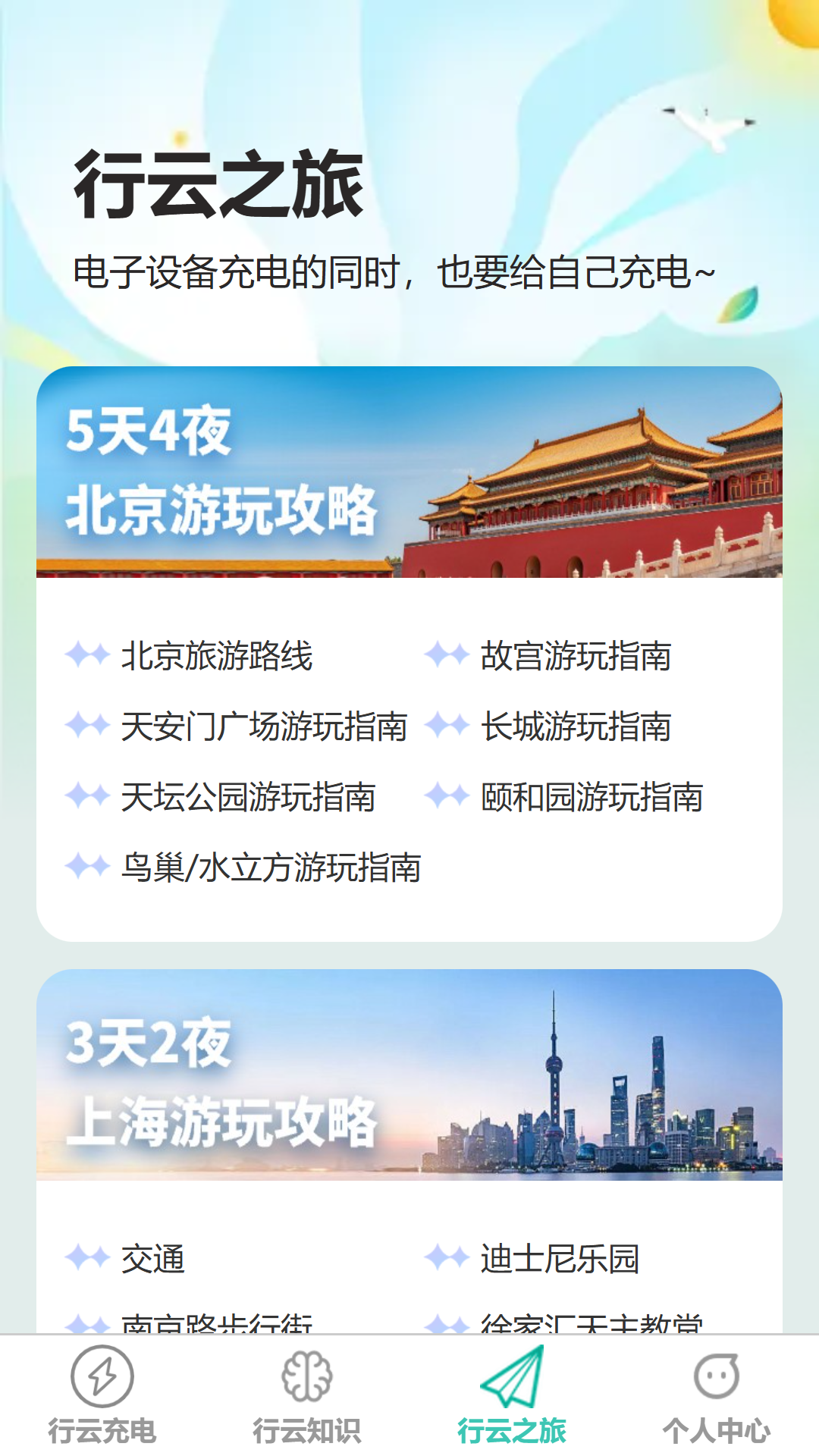 【行云之旅】行云之旅是一种把旅行与充电相结合的独特体验。我们精心规划了众多精选旅行线路,这些线路涵盖自然风光、历史文化、现代都市等多方面内容。行云之旅能够让每一次出行都转变成一次身心得到充电的旅行,让你收获满满的幸福与成就感。