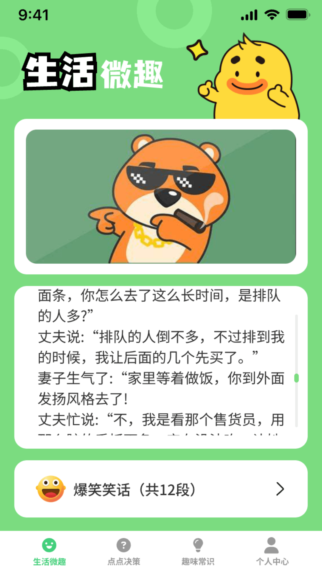 妙趣多多是一款非常实用的软件,它巧妙地将笑话与日常常识融合在一起。软件里有着丰富多彩的笑话资源,这些笑话能为用户营造轻松愉悦的氛围,带您领略来自世界各地的搞笑趣事,让您在欢笑中学习知识。