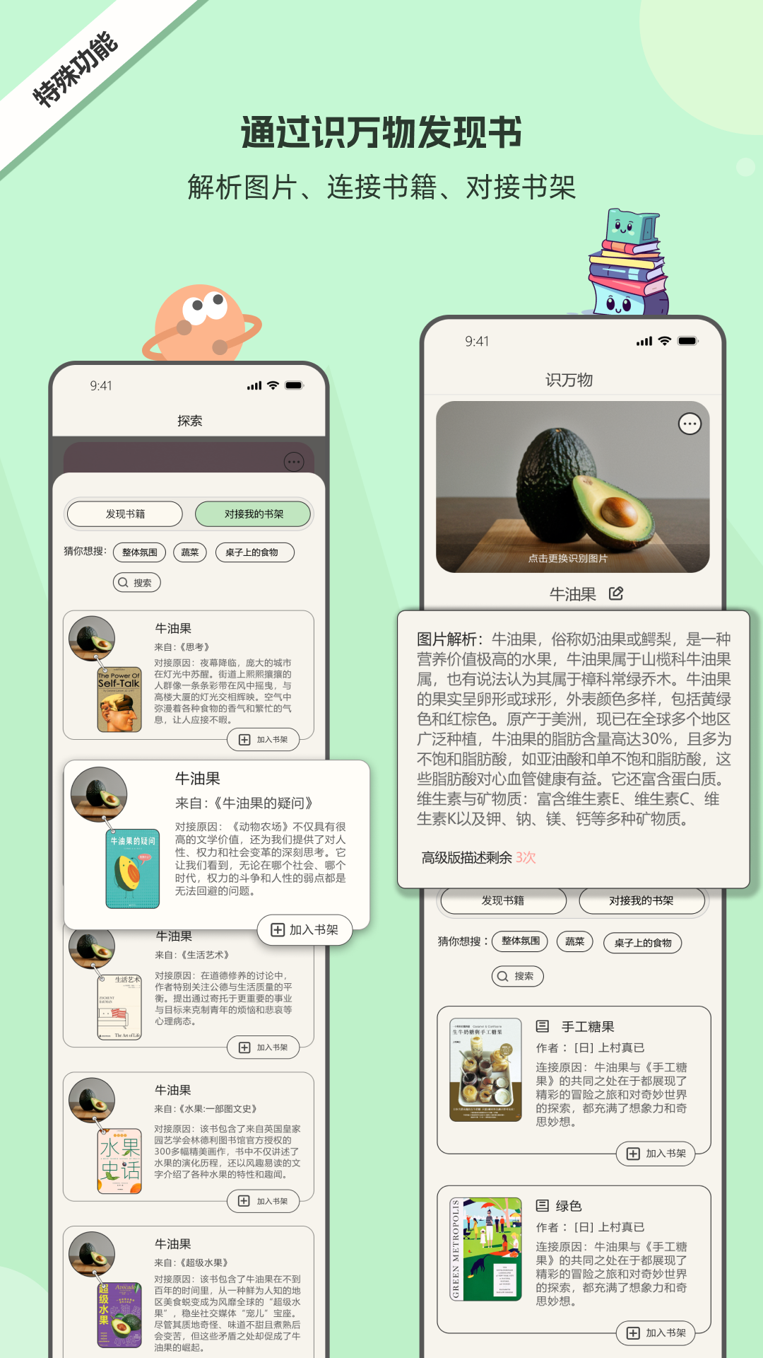 - 该应用可以解析图片以及图片中的各类事物,基于此发现更多相关书籍。同时,它能够对接用户已有书籍中出现的事物,将外界世界与书中世界相连接,为用户带来更丰富的阅读延伸体验。