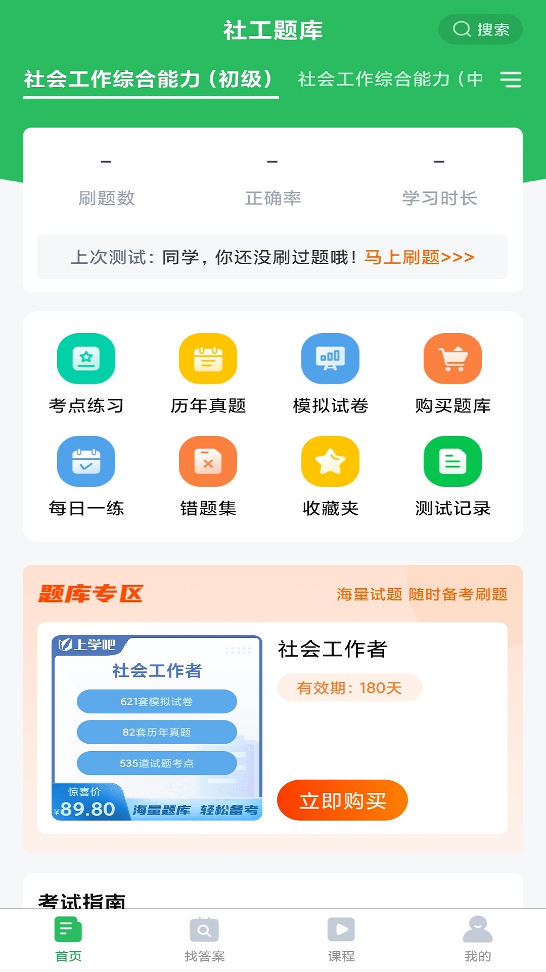 上学吧社工师考试题库提供模拟考场、历年真题练习、每日一练、快速练习、考点练习、考试押题、做题记录等多种多样的学习与做题模式,全方位陪伴您应对社工师考试。