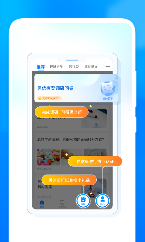 -专业的医学团队精心编写医学问卷,通过这种趣味的方式,可助力用户快速学习专业知识。而且参与其中还能够获得奖学金以及各种奖品作为激励。