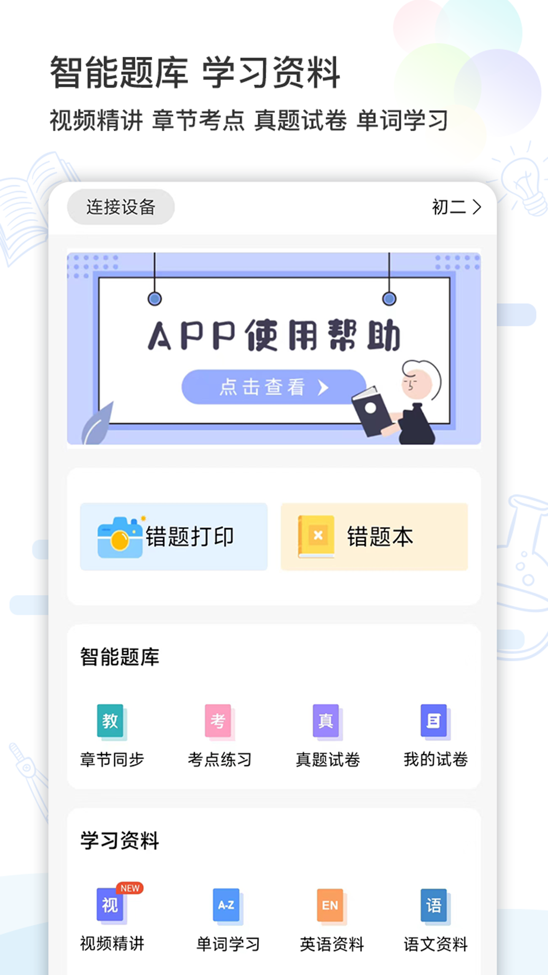 在学习功能方面,它为精准学习提供了诸多便利。其错题打印功能以及错题本功能,能有效帮助学生整理学习中的错题。智能题库涵盖了全科目内容,无论是章节同步学习、考点专项练习,还是提供真题试卷以及支持用户创建我的试卷,都能满足学习需求。学习资料丰富多样,其中有视频精讲可以让学生深入理解知识,单词练习有助于英语学习,口算练习提升数学运算能力,英语资料、语文资料满足语言学科的学习需求,公式大全方便查询各种公式,英汉词典为英语学习助力。