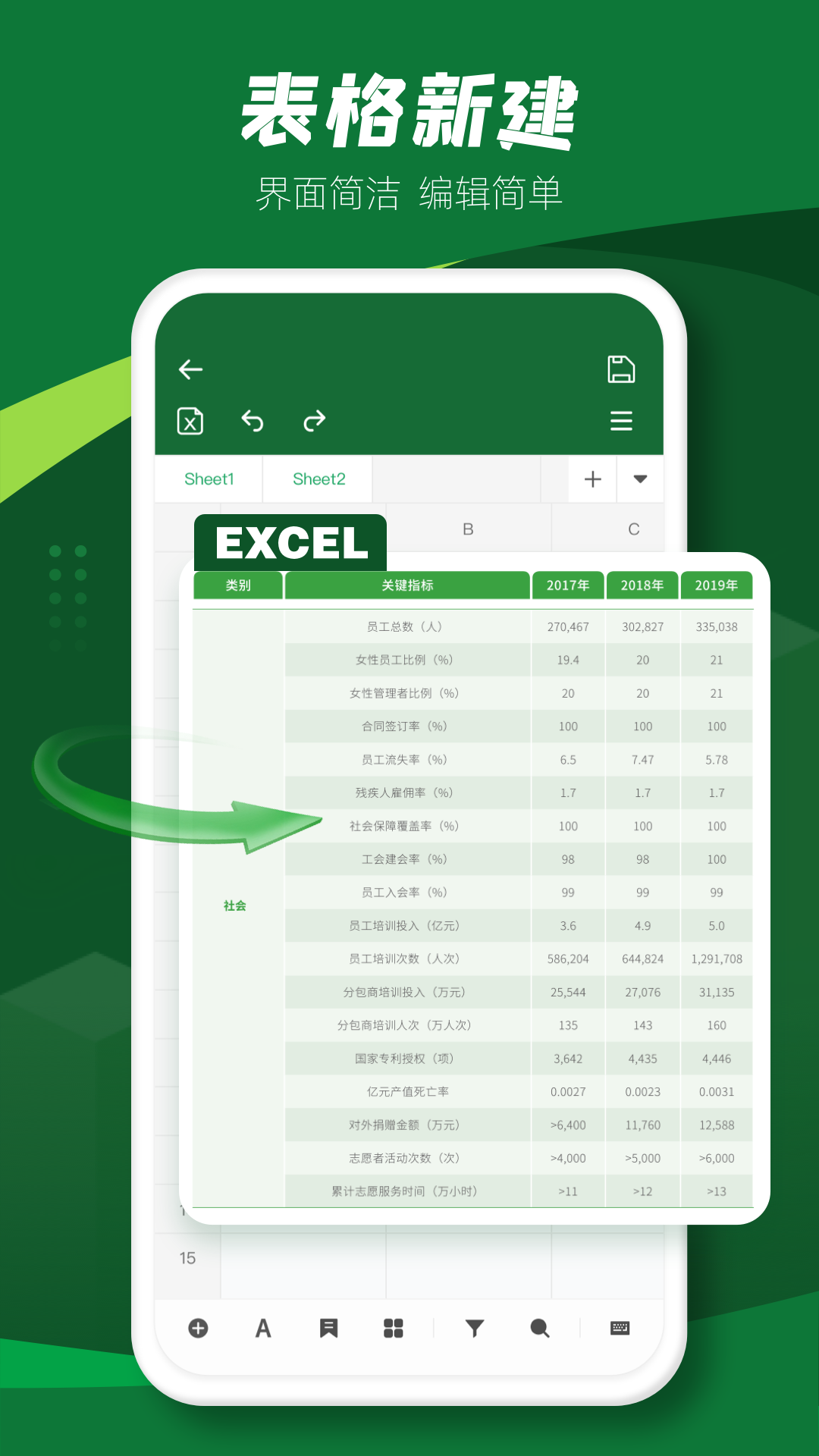 Excel表格是一款可用于移动端手机制作表格的Office办公软件。它支持在线创建以及编辑表格图表。您能够借助该软件在线制作各类表格,像是表格、报价单、考勤表、工资表、课程表、排班表等,还能对手机中的xlsx和xls表格文件进行编辑;表格可导出为PDF格式,具备文字识别功能,也可进行打印操作,并且能通过微信、QQ、钉钉分享给好友以实现在线协作。同时,Excel表格还兼容wps、office、金山文档、腾讯文档等多种格式的文档编辑,您在软件里能够导入手机中在QQ、微信、钉钉等目录下保存和接收的表格文件;软件内部拥有海量的表格模板且会定期更新,可满足您工作与生活中的日常需求!