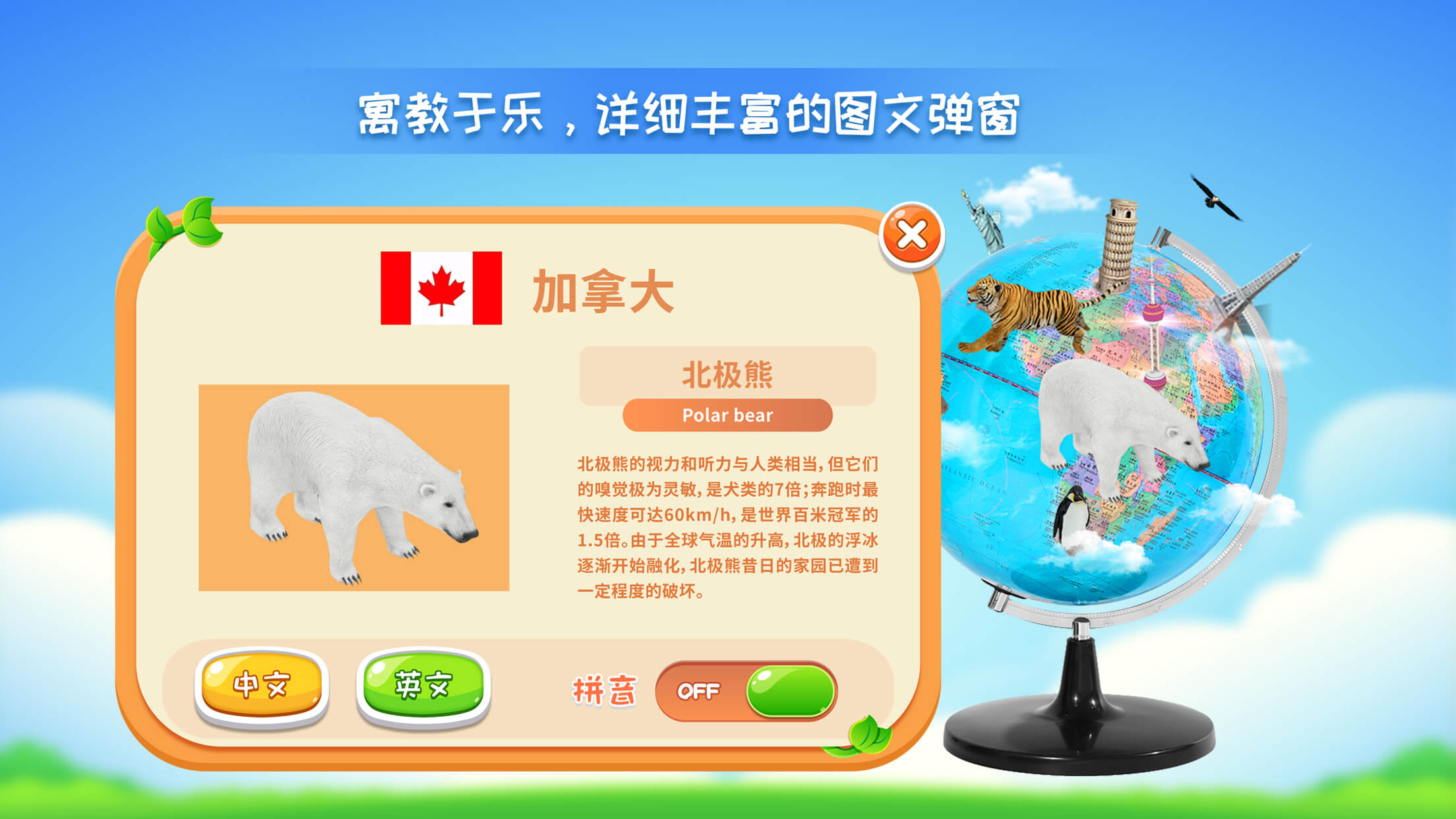 《晟立AR地球仪》是一款专为儿童教育打造的软件,它创新性地把地球仪与AR(增强现实)技术融合起来。这款软件蕴含着丰富的百科知识,其中涵盖动物百科、建筑名胜、地理现象以及国家人文等多个方面。它通过栩栩如生的3D模型动画,构建起适合各个年龄层的科学知识体系。当孩子只需拿出设备对着地球仪扫一扫时,各种各样的动物、建筑等就会逼真地呈现在眼前,同时还有逼真的音效以及语音讲解相配合,让孩子在玩乐的过程中学习知识。