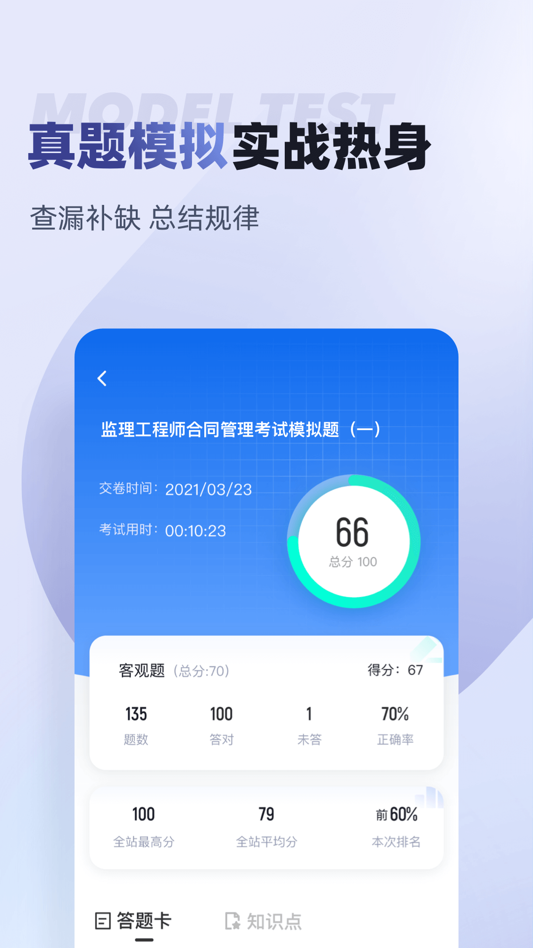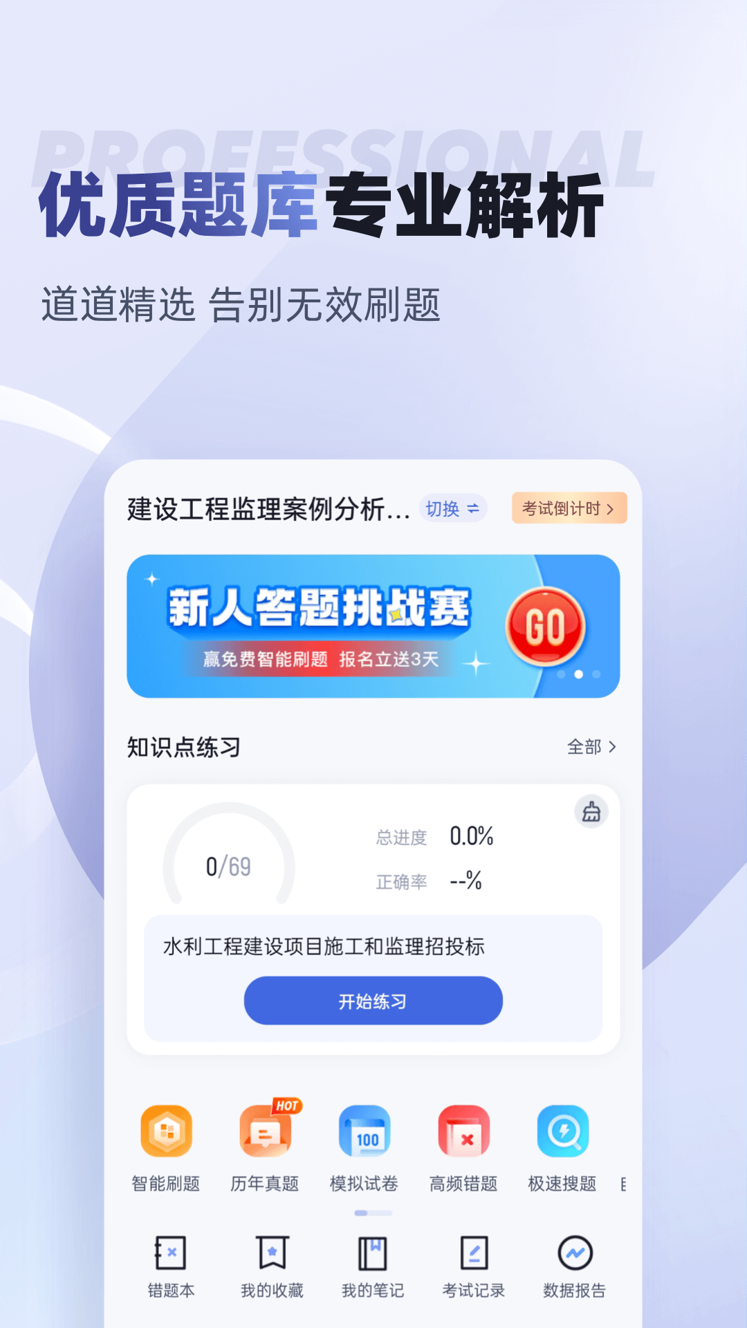 监理工程师题库内含考点练习,全国通用卷以及地区卷模拟练习,以及按照固定考试比重的随机式的抽题的真题考场,成绩单实时记录考试数据,一点一滴的反馈考生近期学习状态以及自我正确率的提升,大大的给予考生通过考试的信心。