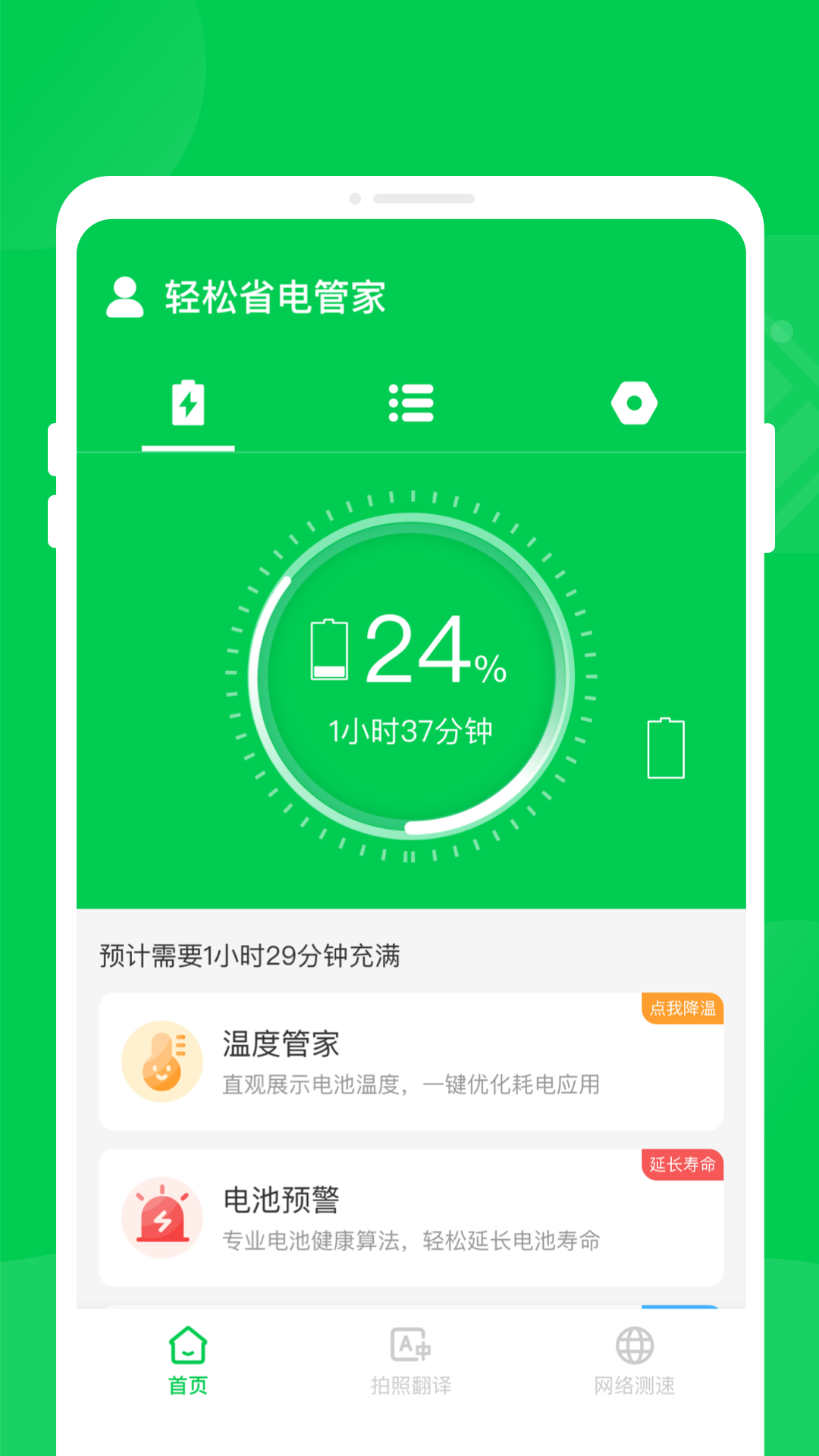 轻松省电管家是一款实用便捷的电池健康省电管理软件,能实时跟踪电量变化,实时掌握手机信息,电池健康检测、一键省电、耗电优化,多维度维护电池健康,延长电池寿命。