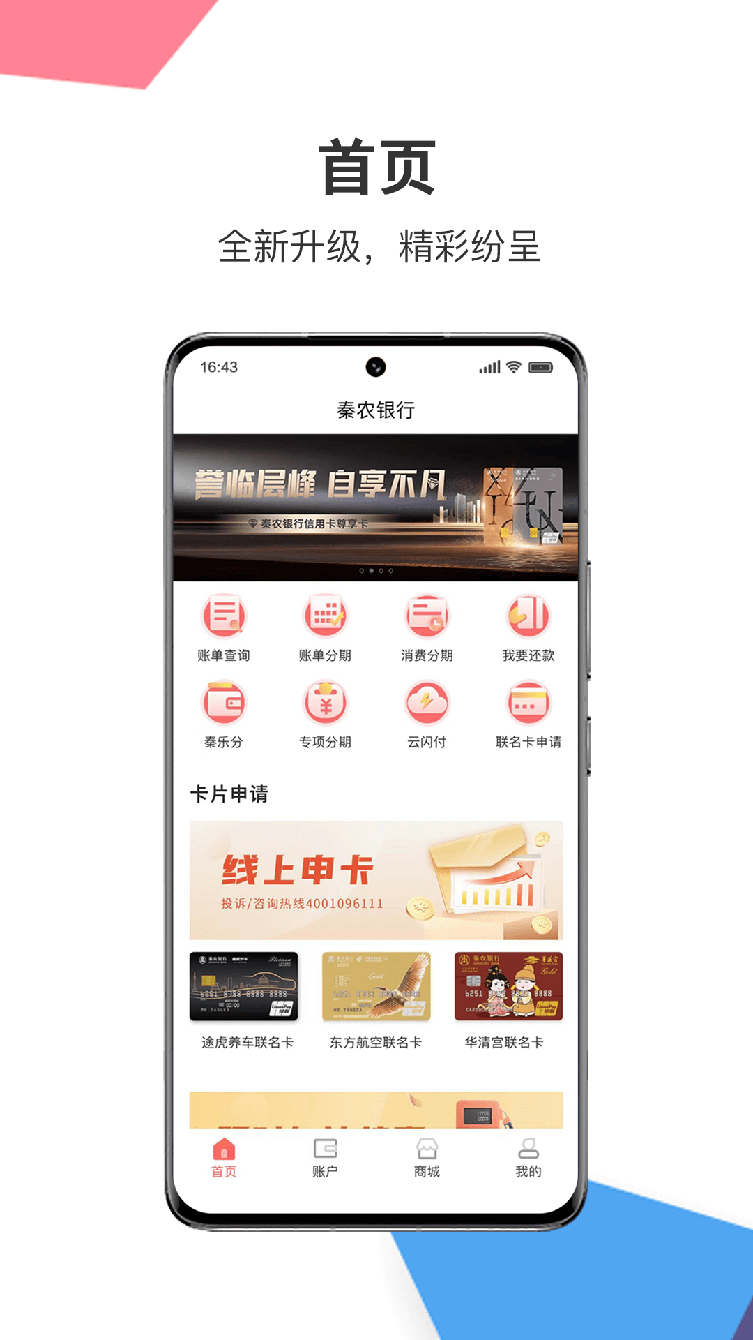 2. “账户”:主要为用户提供账单查询、分期业务(如账单分期、消费分期等)相关功能。