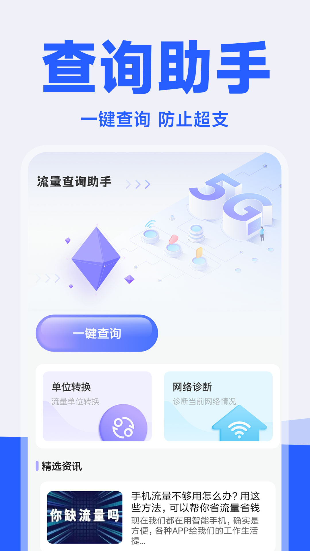流量精灵是一款实用的手机流量、话费实时查询工具,支持话费、流量一键查询,还提供流量单位换算和手机网络诊断,快速计算流量消耗,帮助您有效管理数据使用,避免不必要的超额费用。它不仅能帮助您轻松管理话费与流量,还能提升您的网络使用体验。立即下载,开启您的便捷通信之旅!