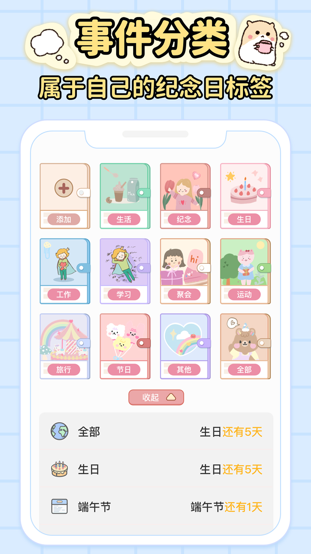 · 多种分类:纪念日、工作、生活,支持自定义更多分类