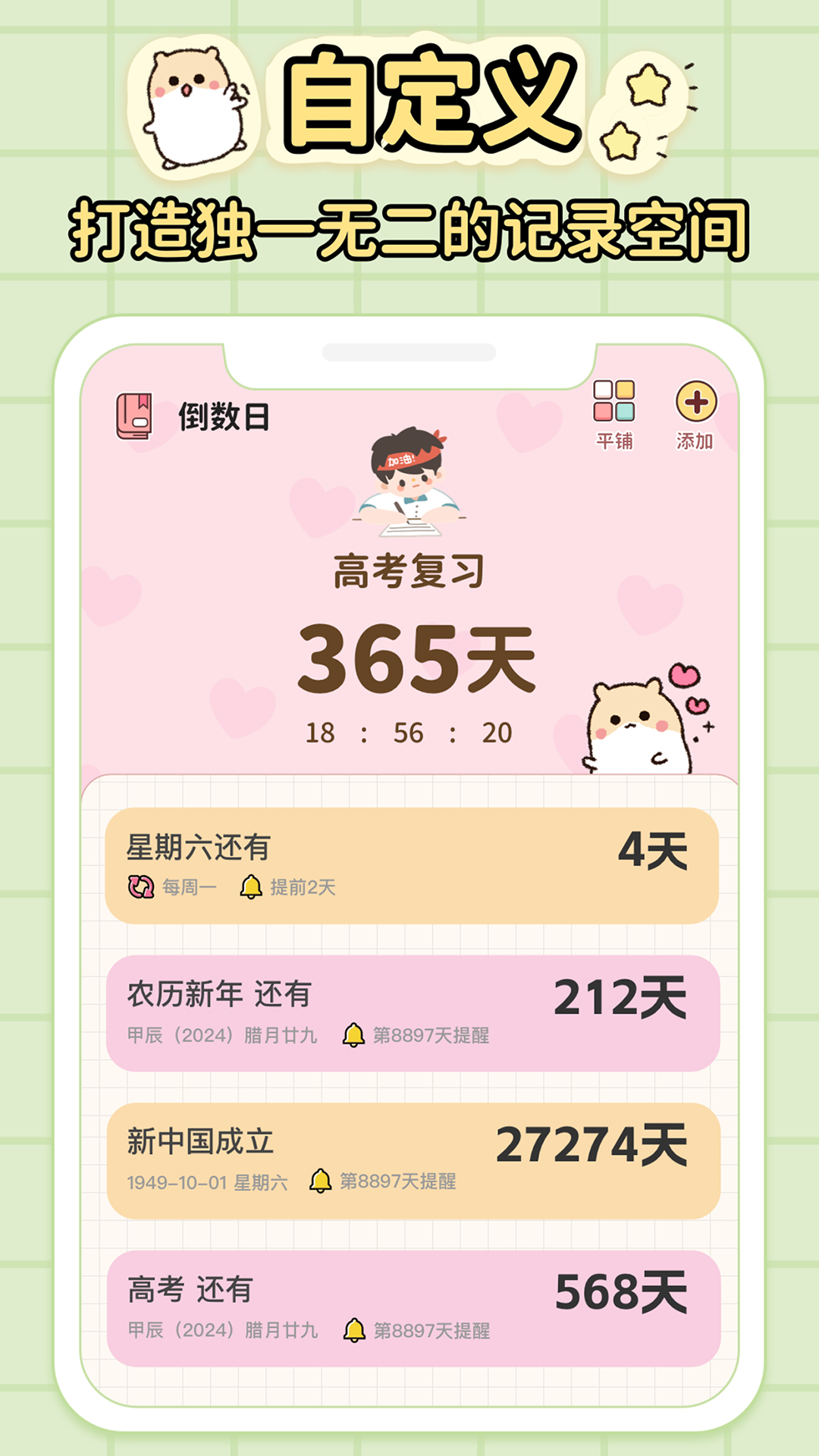 可用于记录:考试倒计时、生日提醒、节假日倒计时、各种纪念日、情侣恋爱天数、单身天数、生命倒计时等等......