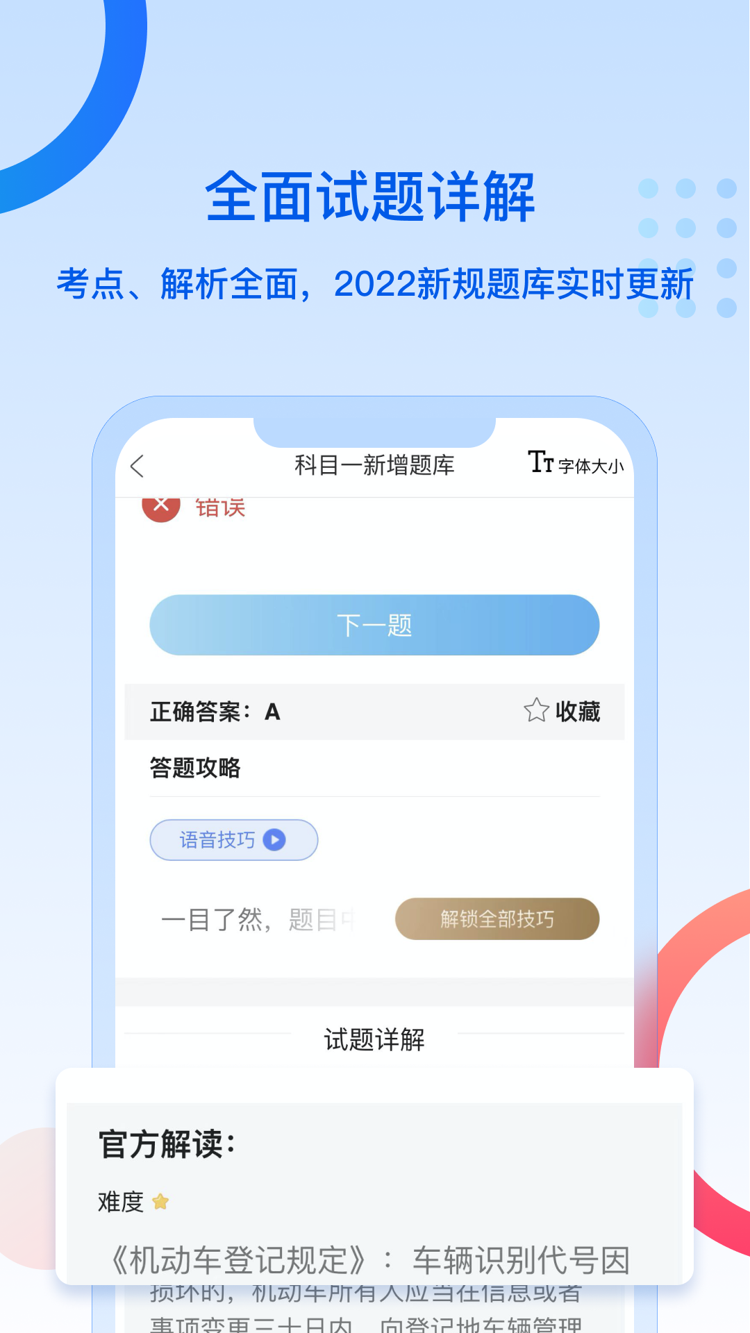 其题库包含了小车、客车、货车、摩托车以及资格证等多种题库,并且会同步多方题库,实现实时更新。