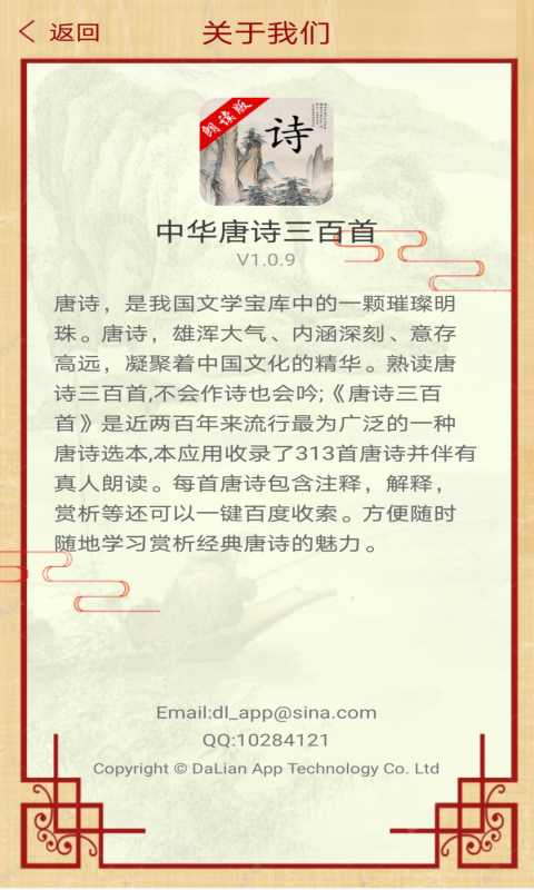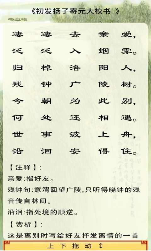 唐诗,宛如我国文学宝库中一颗极为璀璨的明珠。它雄浑大气,有着深刻的内涵,意韵高远,凝聚着中华文化的精华。唐诗把我国古典诗歌音韵和谐、文字精练的艺术特色,提升到了前所未有的高度,是国人传承文明的重要途径。“熟读唐诗三百首,不会作诗也会吟。”《唐诗三百首》作为近两百年来广泛流行的唐诗选本,我们的应用收录了313首唐诗,并且有真人朗读。每一首唐诗都包含注释、解释、赏析等内容,还能够一键进行百度搜索,方便使用者随时随地学习和赏析经典唐诗的魅力。
