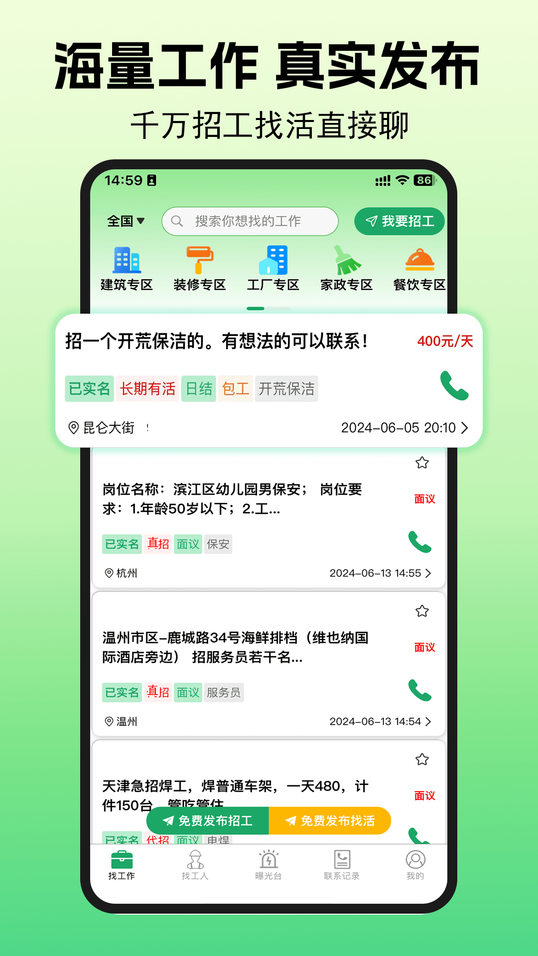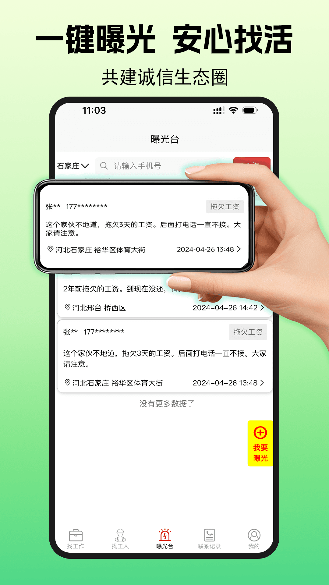 其一,曝光台。这是行业内首个创建的曝光体系,它能够为老板和工友在招工找活过程中提供更可靠的安全保障。