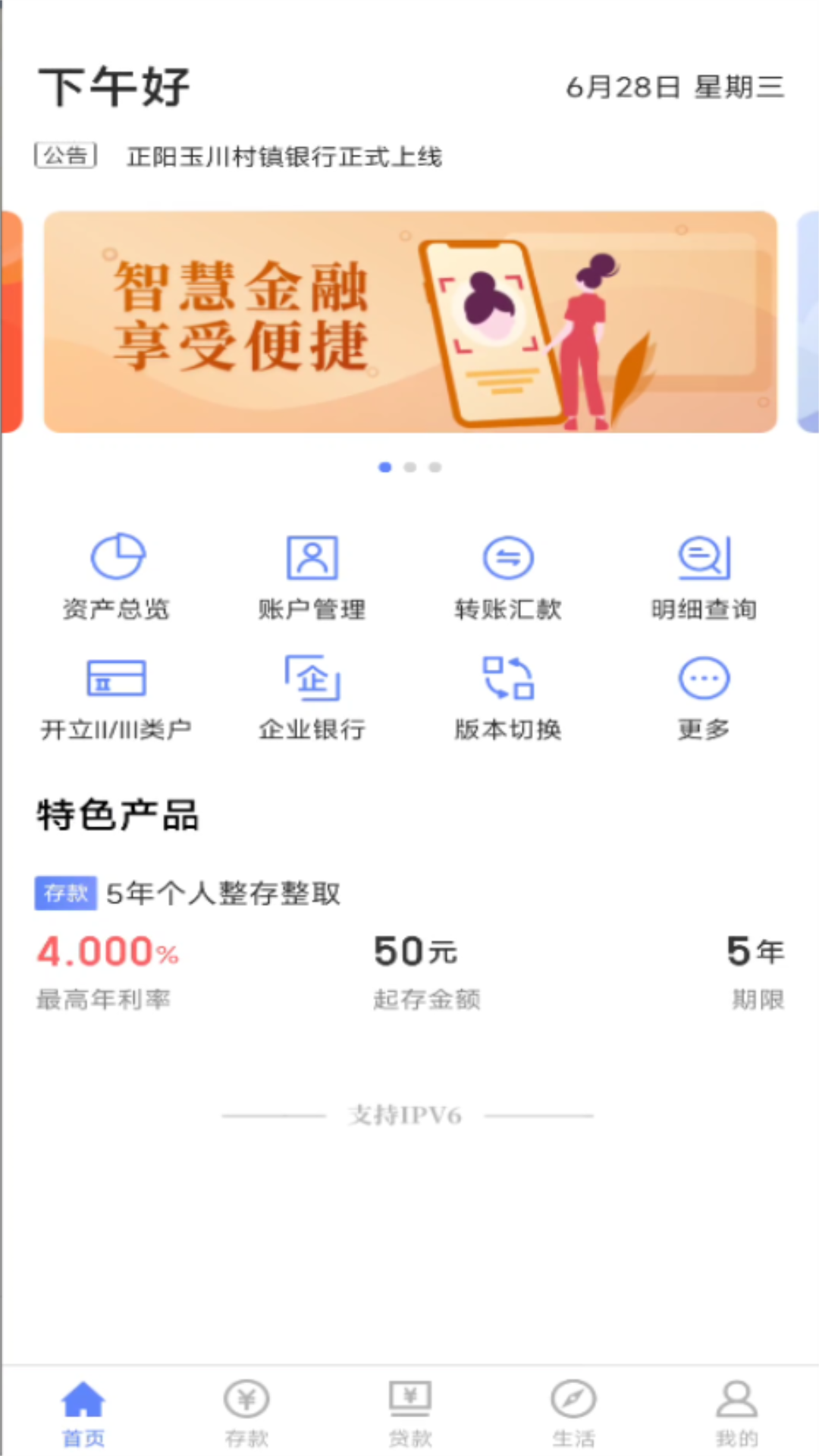 正阳玉川村镇银行手机银行安卓客户端。正阳玉川村镇银行是经国务院、中国银监会批准,加入中国人民银行金融管理和服务体系的合法金融机构,与其他国有商业银行具有相同的性质和经营范围。我行致力于为正阳县域村镇发展提供有力的资金支持,促进区域经济的发展,为本地农民、农村和农业的快速发展提供全面、周到、贴心的金融服务,致力于群众,服务于“三农”。