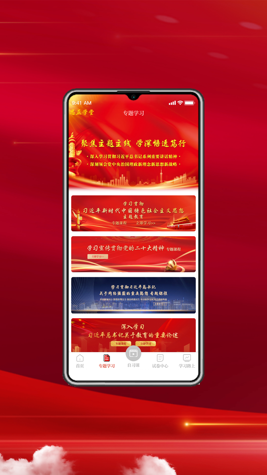 推进强国建设、民族复兴伟业,既需要强大的物质力量,也需要强大的精神力量。 为深入学习贯彻新时代中国特色社会主义思想,引导用户不断增强“四个意识”、坚定“四个自信”、做到“两个维护”,中科教育特别打造了以爱党、爱国、爱社会主义为主线,以学习宣传贯彻党的二十大精神为重点,融合海量思政教育内容和实用学习功能于一体的“思正学堂”APP。