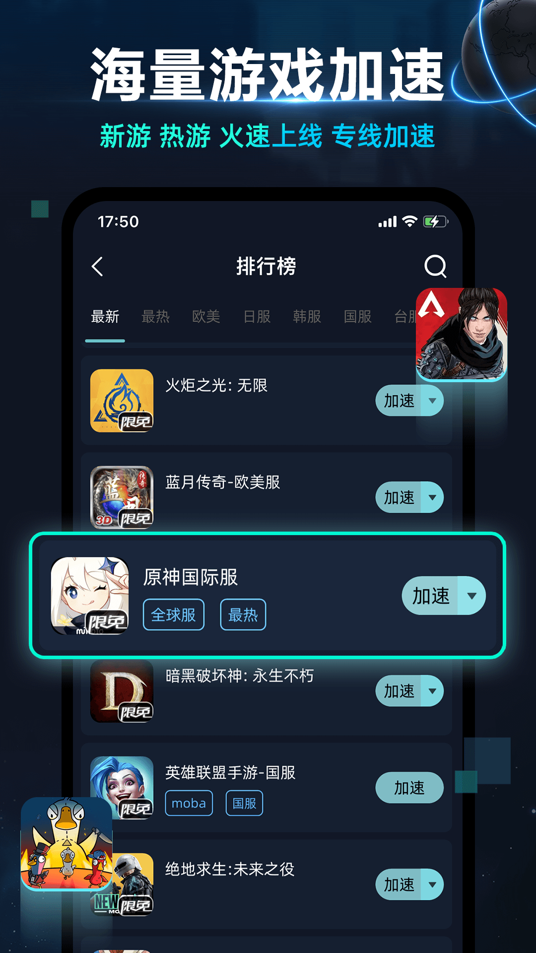热门游戏全覆盖,支持3000+手游加速,吃鸡游戏,apex英雄、PUBGM、使命召唤战区、DNF、王者荣耀国际服、绝地求生:刺激战场、刺激战场、吃鸡外服、蛋仔派对、胜利女神NIKKE、夜鸦国际服、星之后裔、罗布乐思、steam+chat、鹅鸭杀,暗区突围国际服、跑跑卡丁车、我独自升级、阿斯达年代记、渡鸦2、火炬之光无限、TWITCH、SwitchOline、炉石传说、王权之忆、英雄联盟手游、飞机大厨、咒术回战、宝可梦大集结、战地手游、瓦罗兰特手游、剑灵2、明日之后、碧蓝档案、云顶之弈手游、方舟生存进化等一键智能加速。