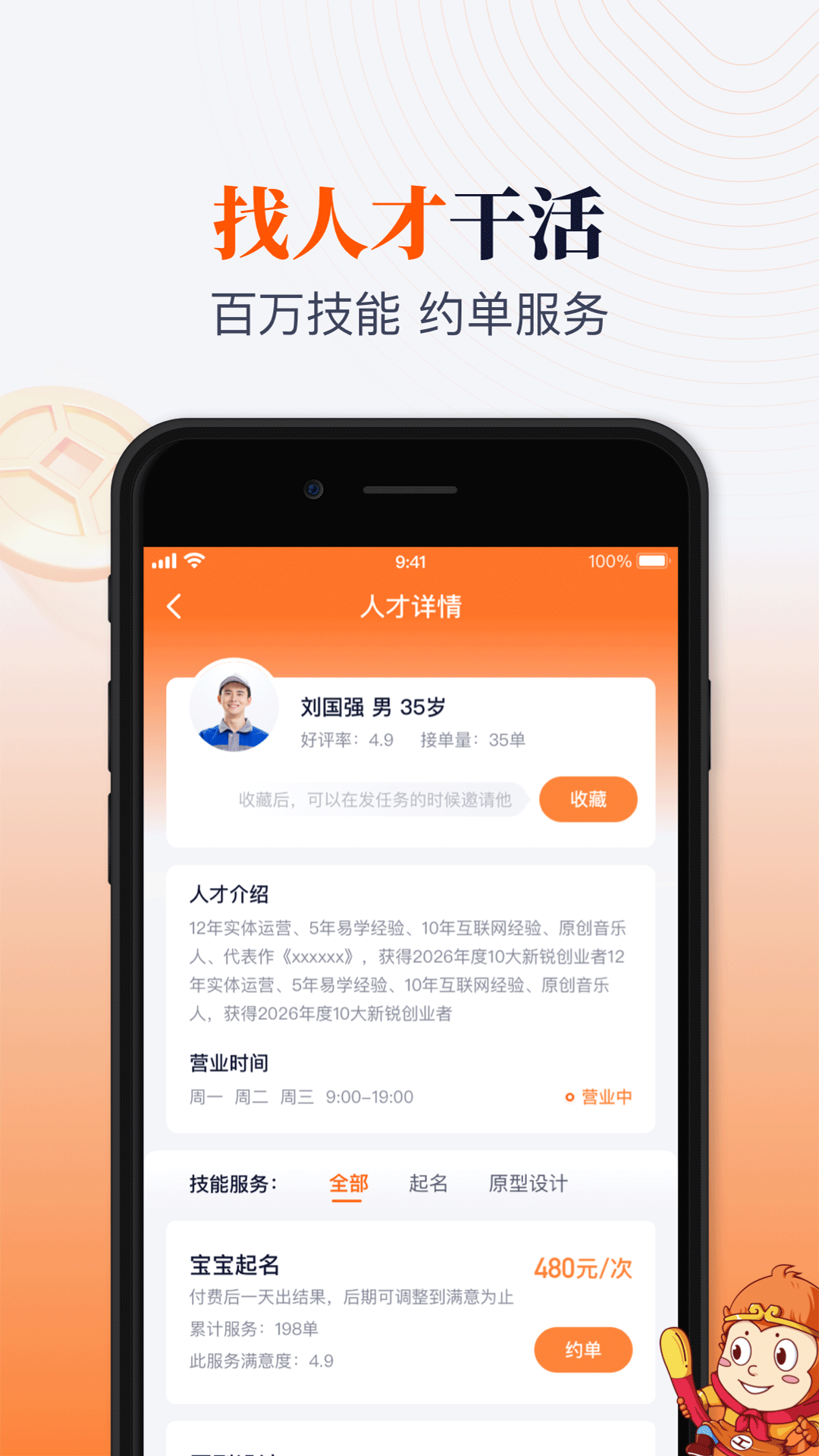 - 工种与技能丰富:有百类工种供您选择,千个技能为您所用,还有百万帮主为您提供服务。