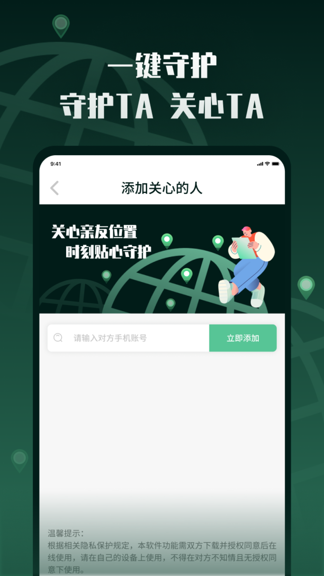 特别提醒: 本软件仅适用于家庭成员、朋友和亲友之间的自愿和知情同意使用。未经对方同意,严禁使用本软件进行位置监控。我们致力于维护您的隐私和安全,同时帮助您更好地关心和保护您所珍视的人。