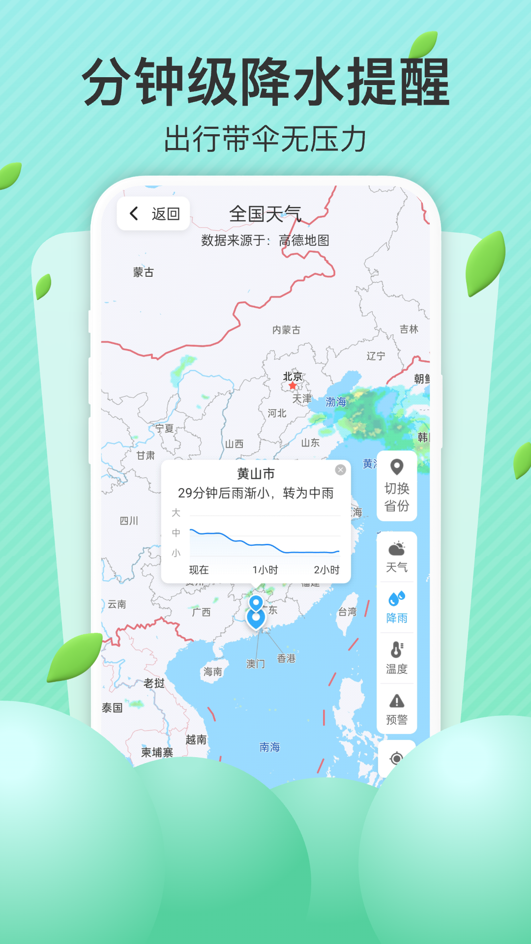 5)短时雨雪:两小时内降雨趋势,分钟公里级气象级预报,雨势图一目了然
