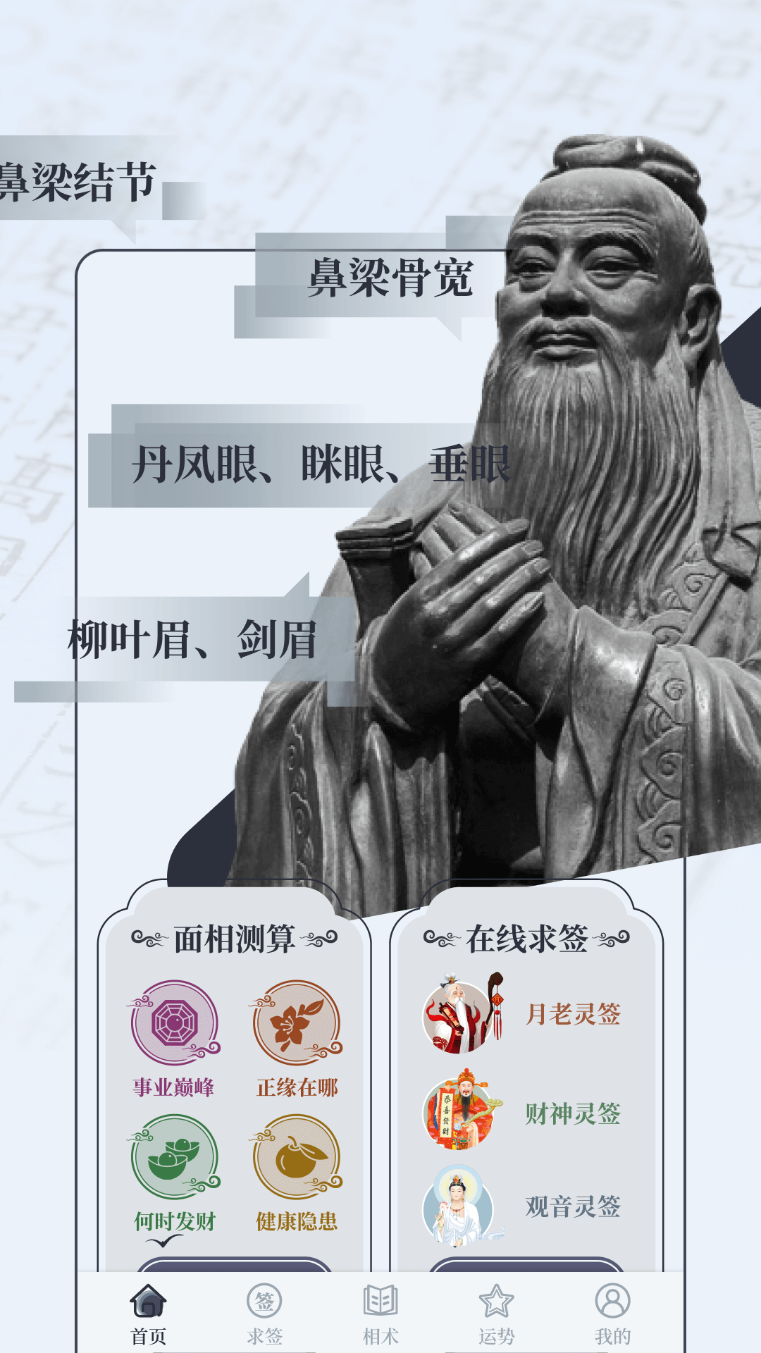 我们是一款全能测算APP,将先进的人工智能技术与传统预测方式完美结合,这里涵盖了中国传统黄历占卜、面相十二宫以及古典周易等内容。这种别具一格的融合方式能够引领您开启面相学神秘世界的深度探索之旅,精准解读隐藏在您五官、面部轮廓以及神态里的命运奥秘。