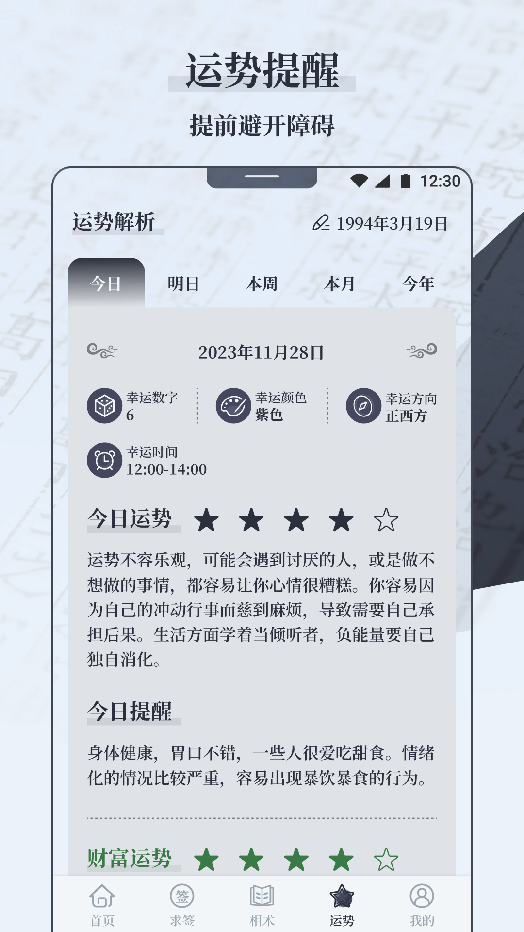 4. 古典周易:每日面相融入古典周易的智慧,以卦象为依据,剖析您的过去、现在和未来。这将为您提供极具针对性的人生指引,协助您在纷繁复杂的生活中找准方向。