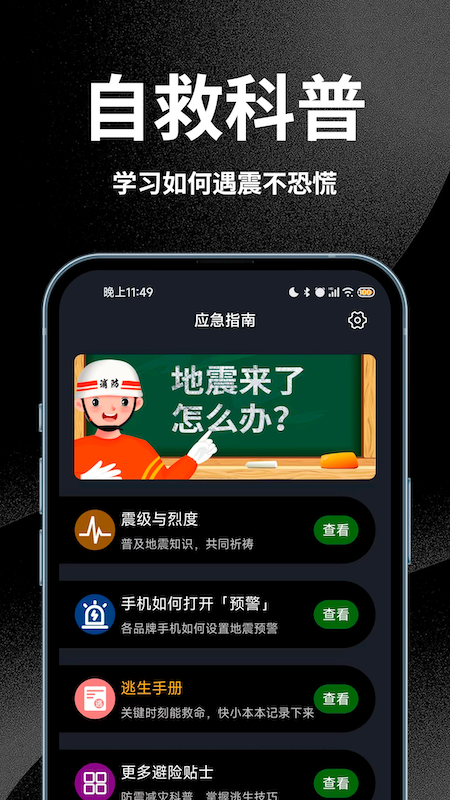 4. 自救科普:用户可以在这里学习到在遇到地震时如何做到不恐慌的知识。