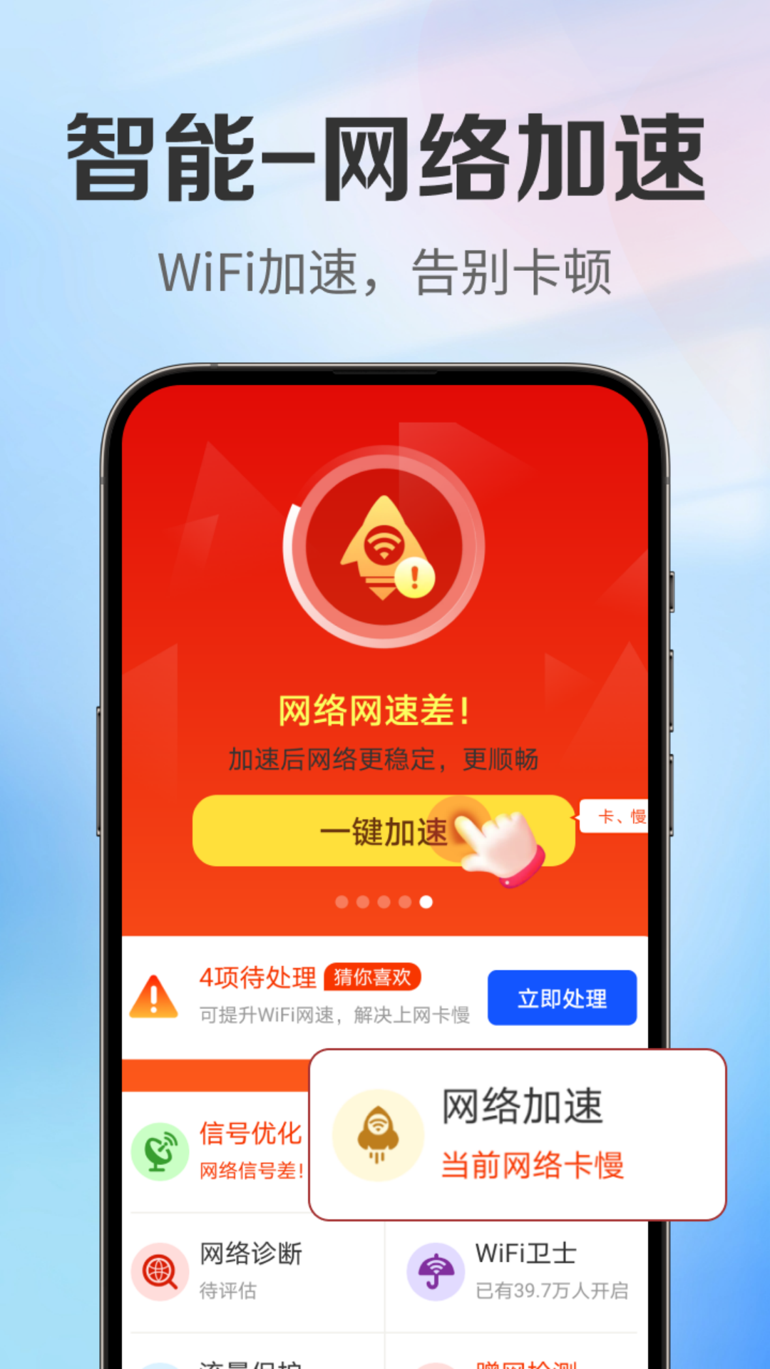具备了【免费WiFi】【网络加速】【信号增强】【一键测速】【防蹭网】等特色功能,助您轻松使用网络:让您的上网环境更安全!是大家信赖的WiFi应用!