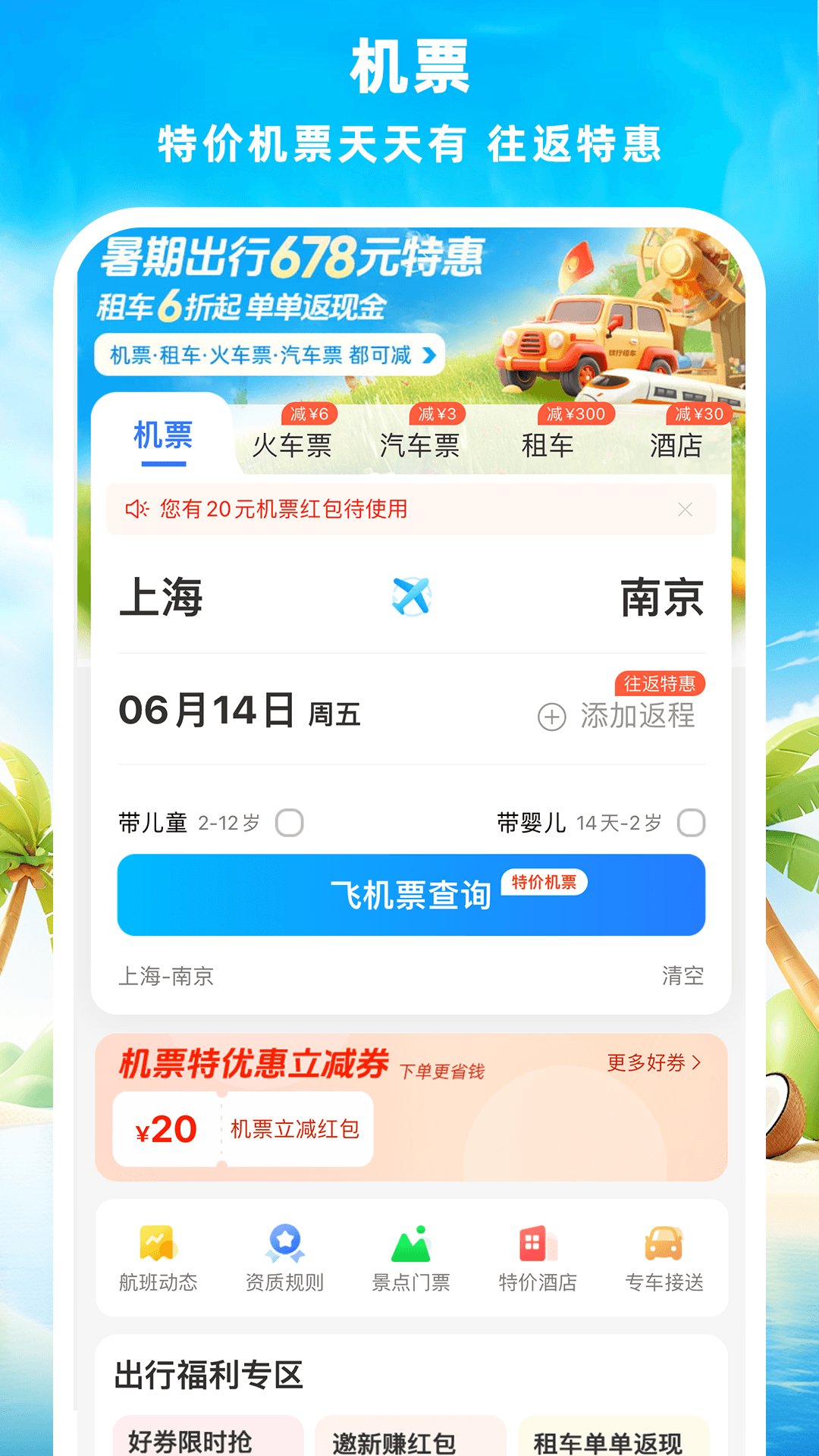【超值特价机票】这里天天都有特价机票供应,而且能享受到机票折扣优惠。往返机票的特惠还能双重叠加,价格透明,每单都有立减优惠。线上办理退改签方便又快捷,让您省心预订机票。