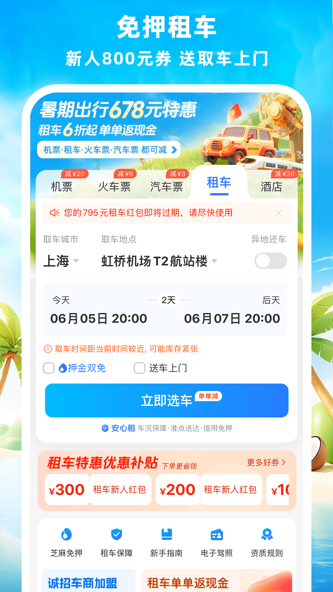 【免押租车超划算】租车业务不但每单都返现金,而且租车押金双免哦。租车公司还提供送车上门和取车上门的服务,覆盖500多个城市,有10000多种车型供您选择。租车时更能享受抵扣优惠,新用户还有800元的礼包,性价比超高,让您节省更多费用!