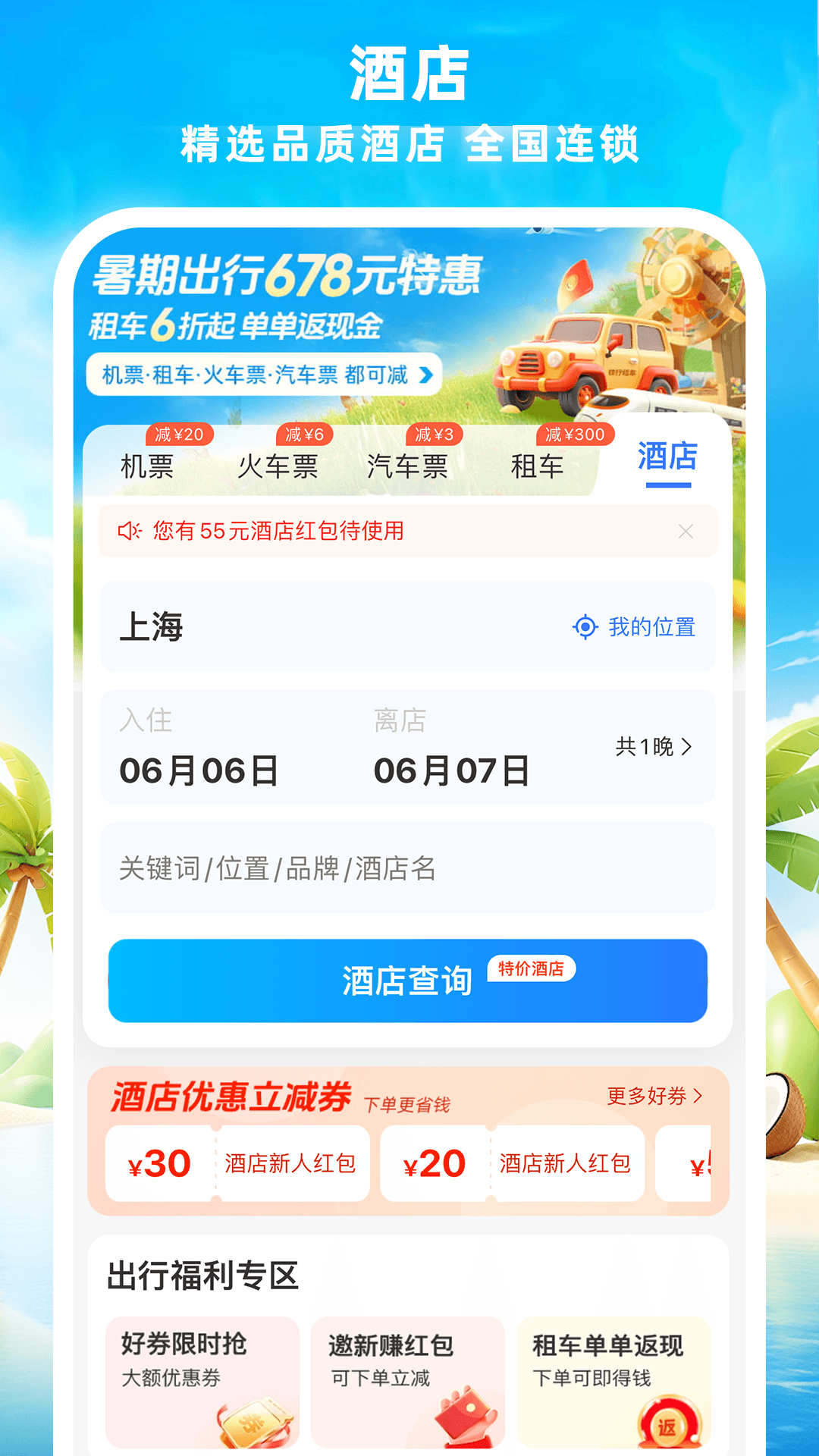 【酒店预订】全国范围内的酒店都可在线预订,无论是钟点房、品牌酒店还是民宿等这里都有,还能享受优惠补贴呢。