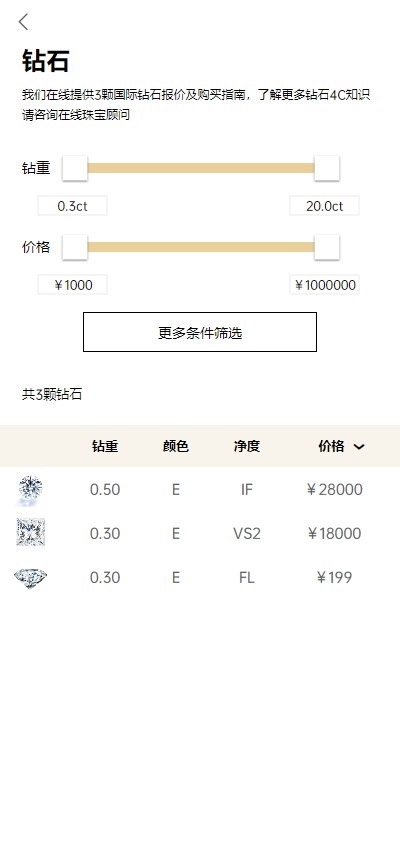 飞儿珠宝APP能为您提供款式最新且最全的钻戒、对戒以及各类钻石首饰。这里精选GIA钻石,您可以随时随地查询价格,还能实时在线查看GIA证书、高清的钻石图片或者视频呢。