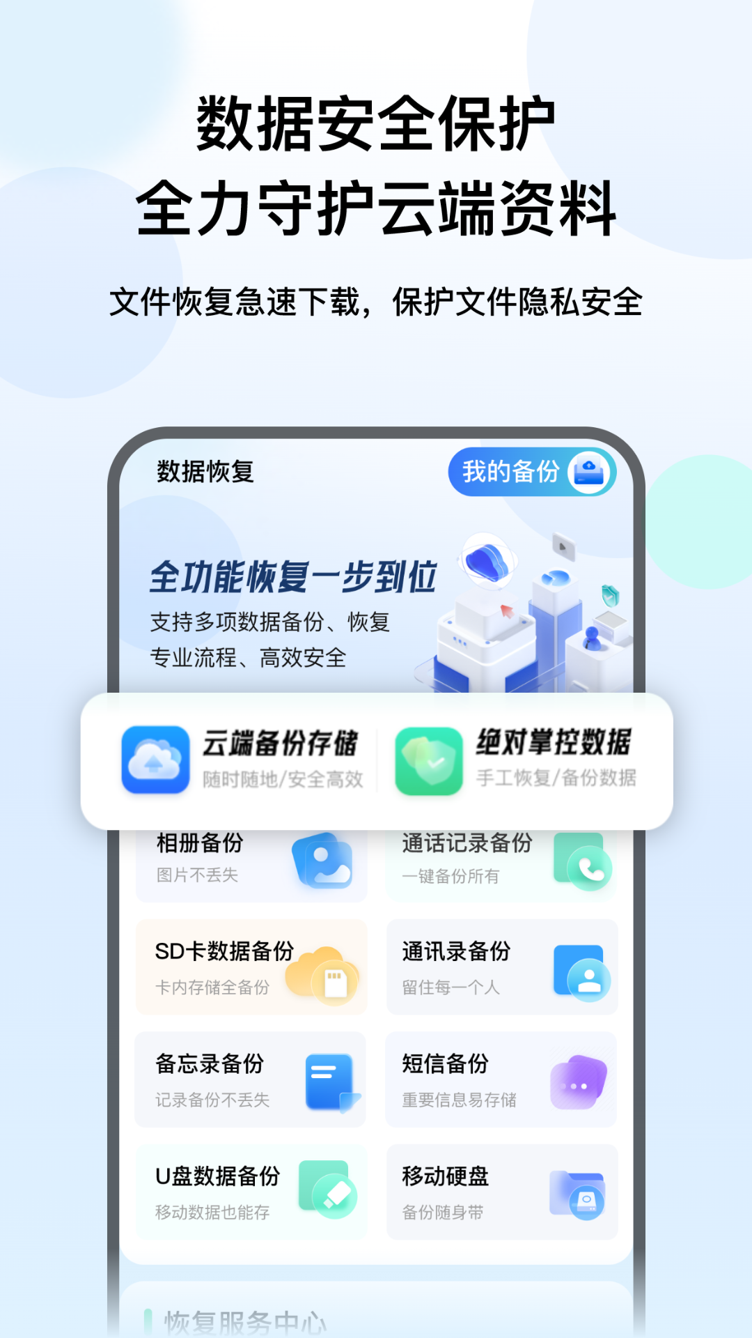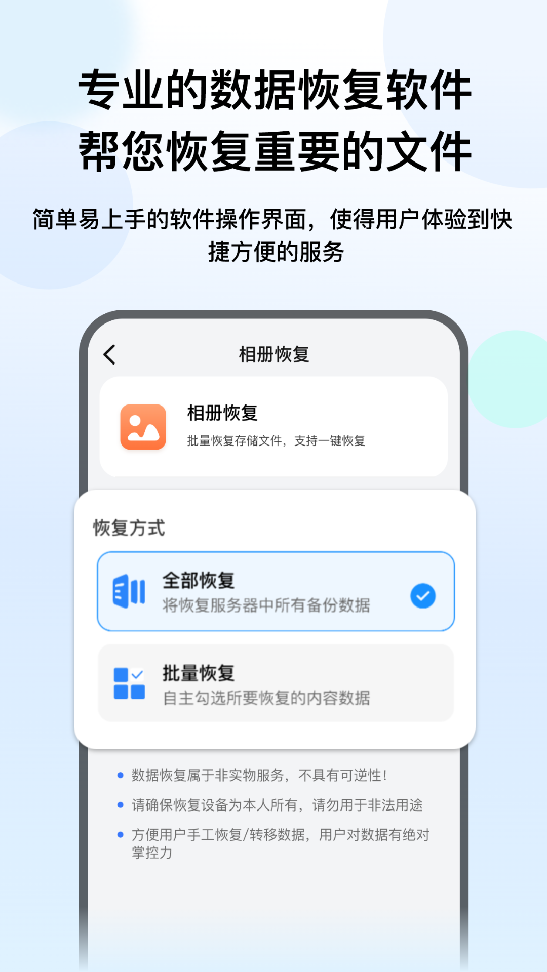 数据恢复:需要恢复已备份的数据时,可以将你备份的快速找到进行恢复。还可以找回你误删或者丢失的重要信息哦,对想要恢复的数据还可以自定义选择。