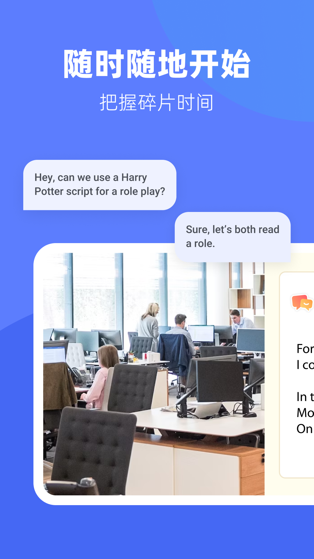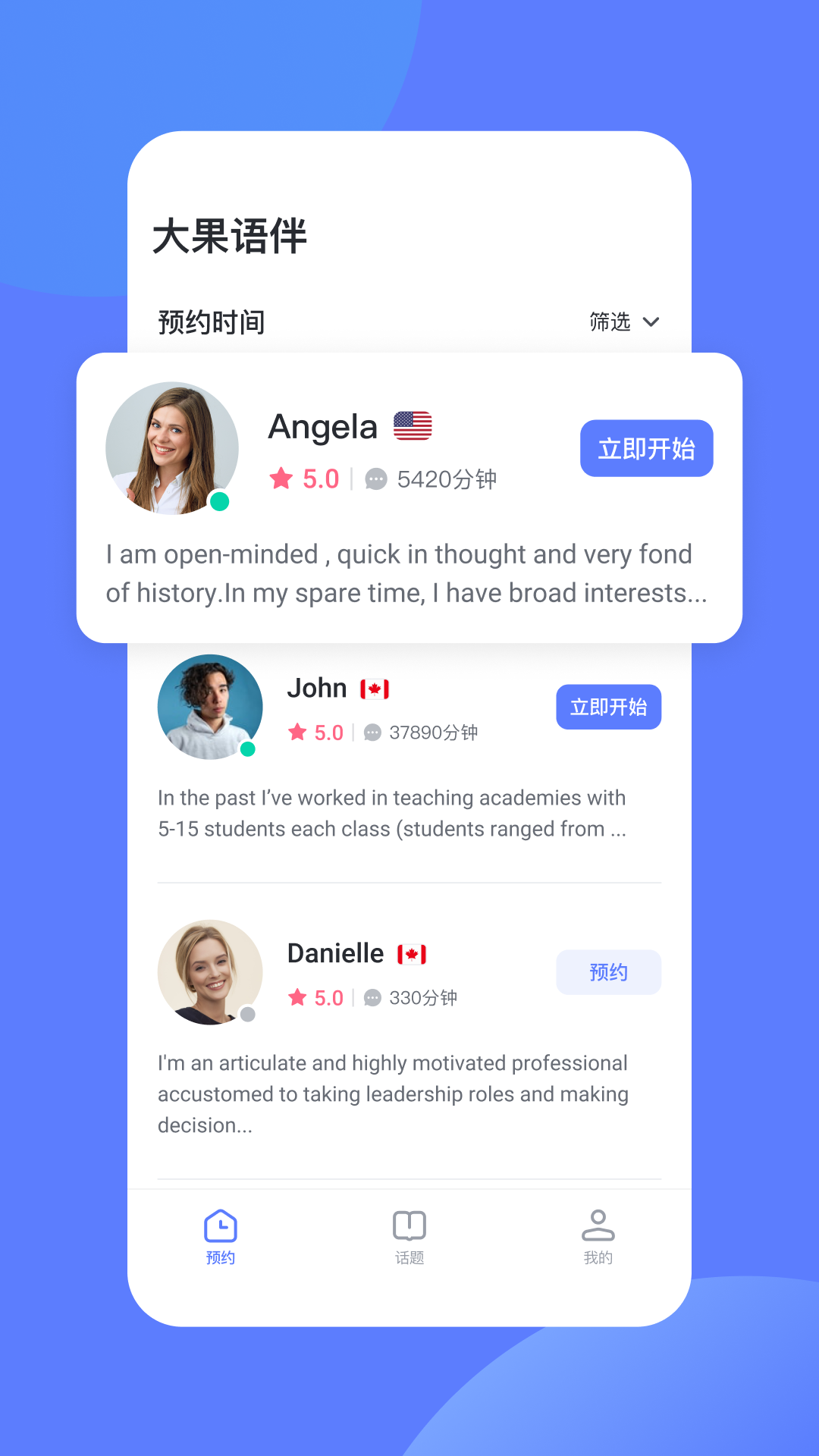 大果语伴致力于为您提供丰富多彩的语言交流体验。我们的语伴随时在线,满足您的需求,为您提供真正的英语口语交流机会。加入大果语伴,与我们的语伴建立联系,畅谈各种话题,充分利用碎片时间,开启崭新的语言交流旅程!