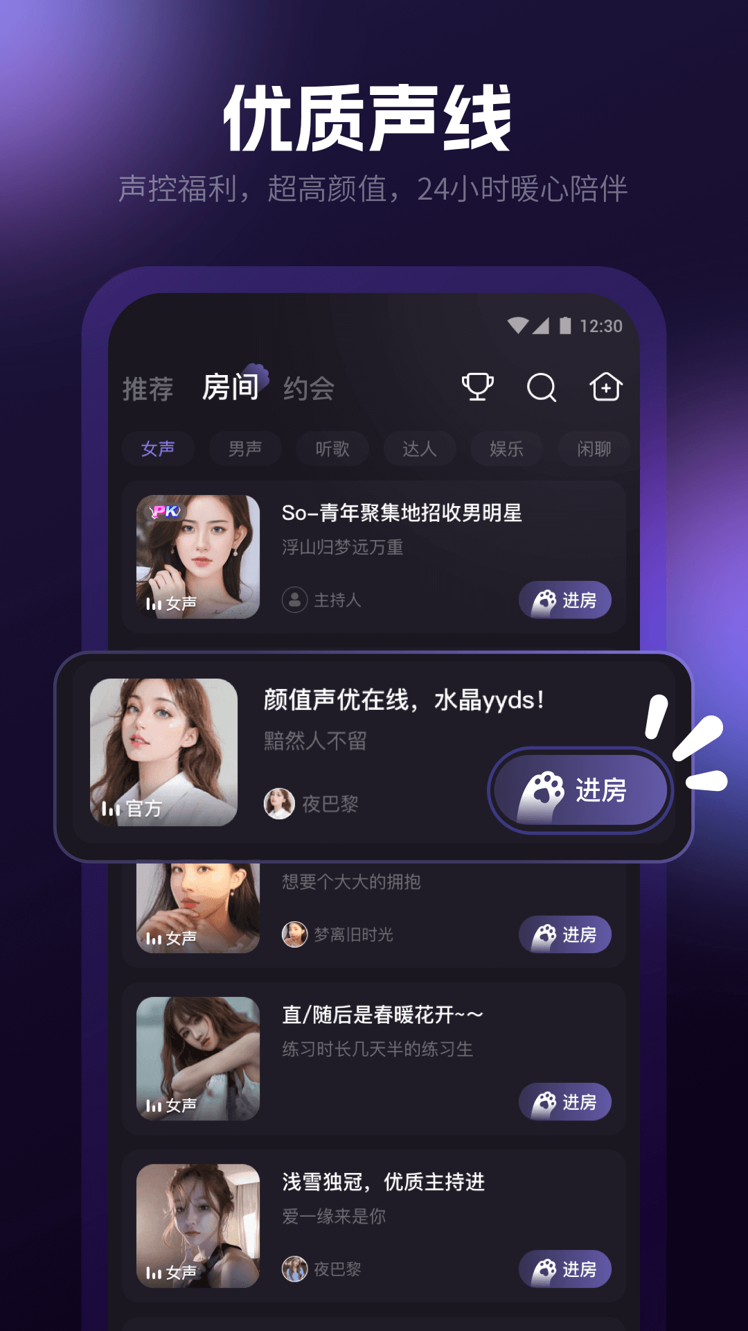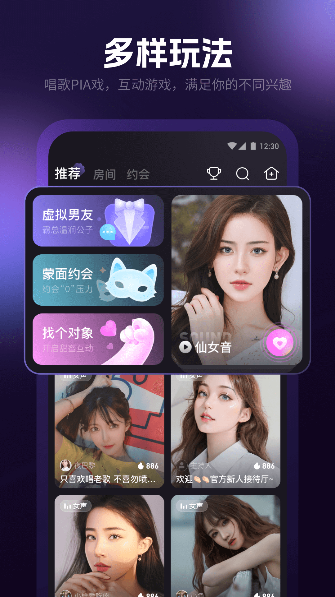 【特色玩法】唱歌、Pia戏、互动游戏、相亲交友、达人电台等等,各种玩法有趣又好玩。