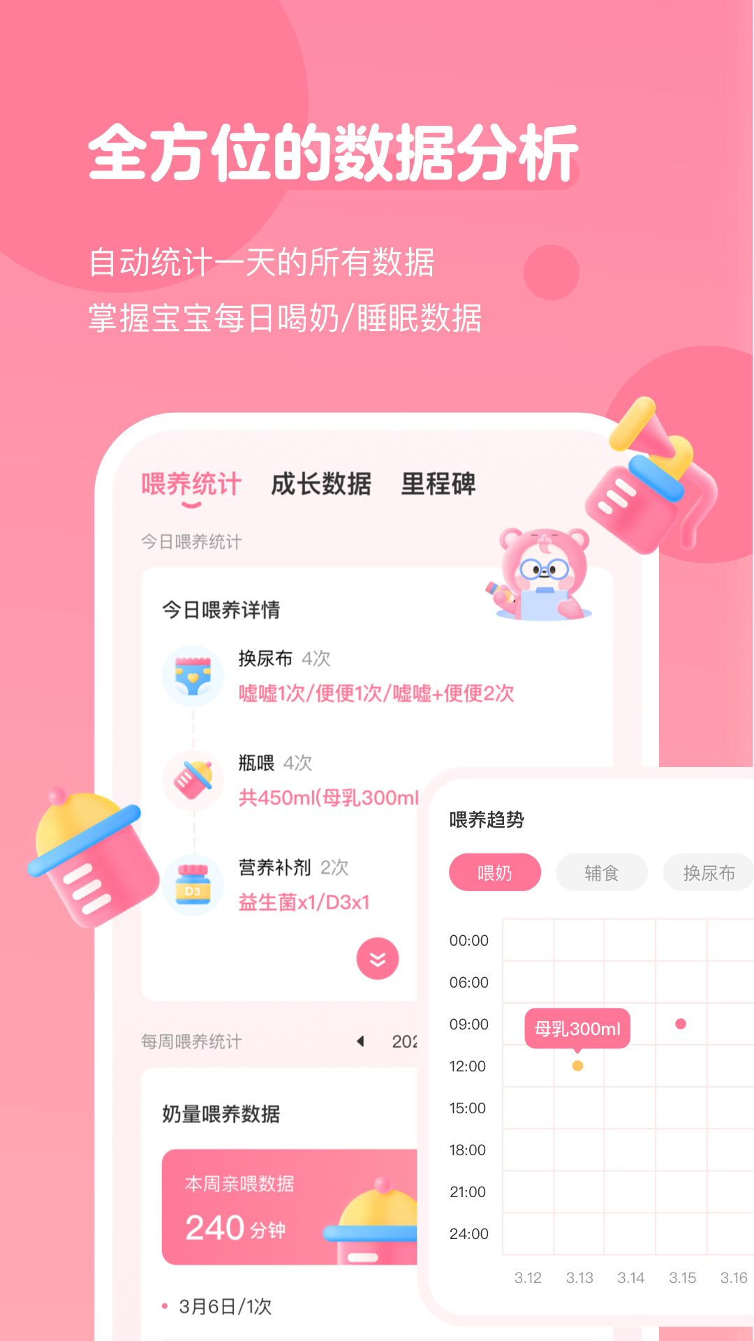+每周哺乳数据:对宝宝每周的亲喂、瓶喂哺乳数据加以分析,让宝爸宝妈清楚掌握每周宝宝母乳、配方奶、饮用水的喂养毫升数。