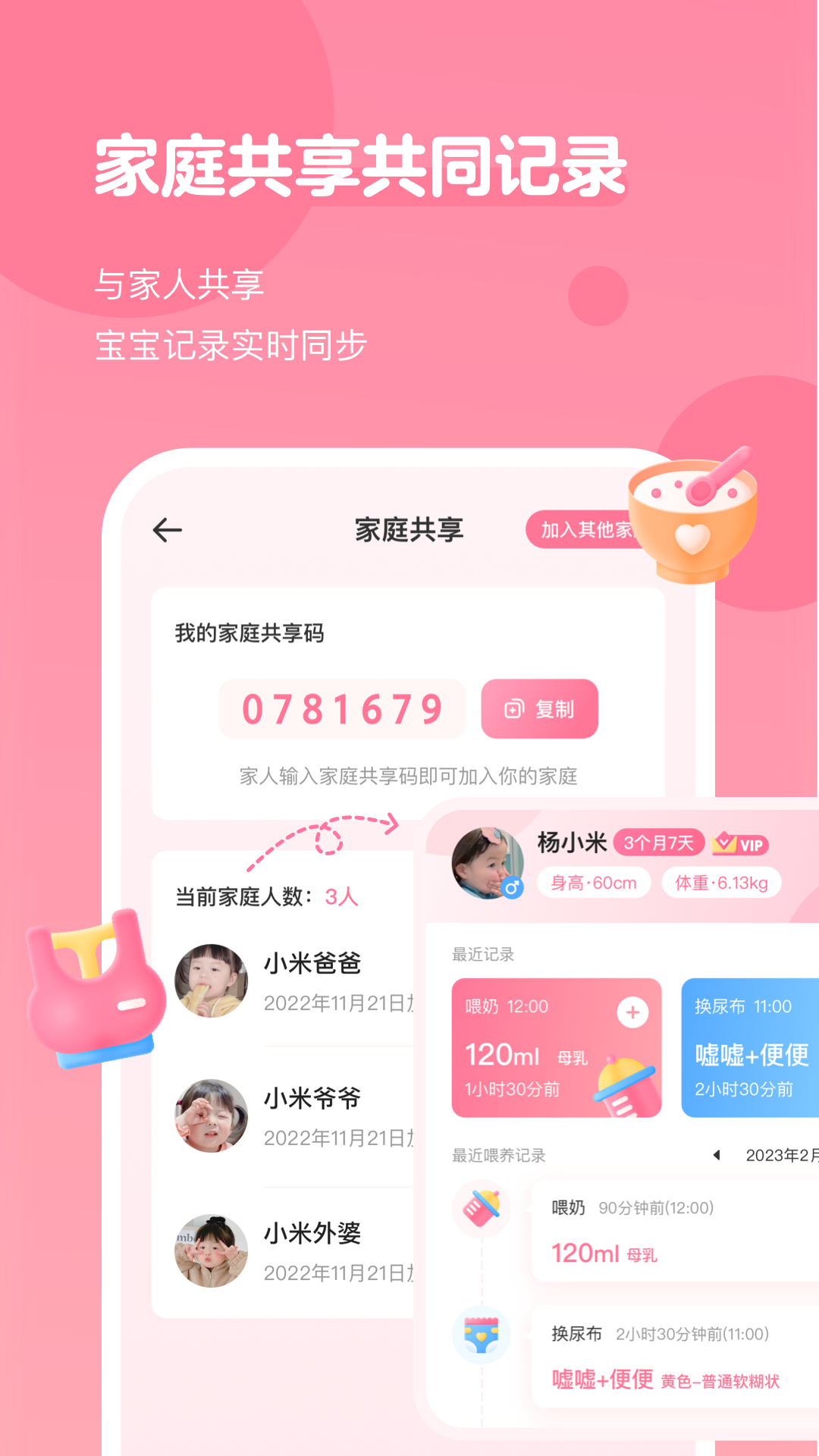 +家庭共享:家人可以共同参与宝宝日常生活的记录工作,数据会自动同步,使用起来极为便利。