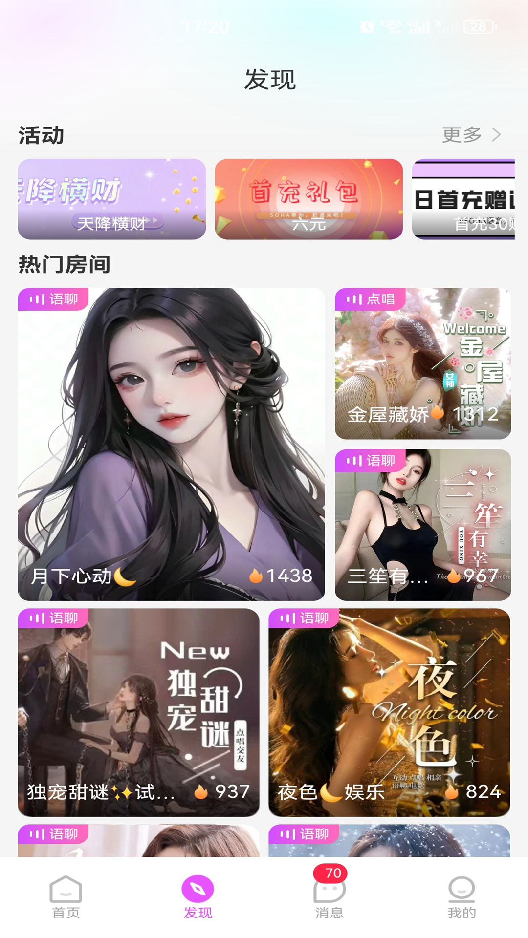 野花谷,一款超棒的在线视频直播、语音聊天交友APP。在野花谷里,颜值超高的女主播们全天24小时进行视频直播,时刻等待着与大家聊天交友呢。无论何时何地,只要你想聊天交友,这里都能满足你,众多的主播等你来挑选!