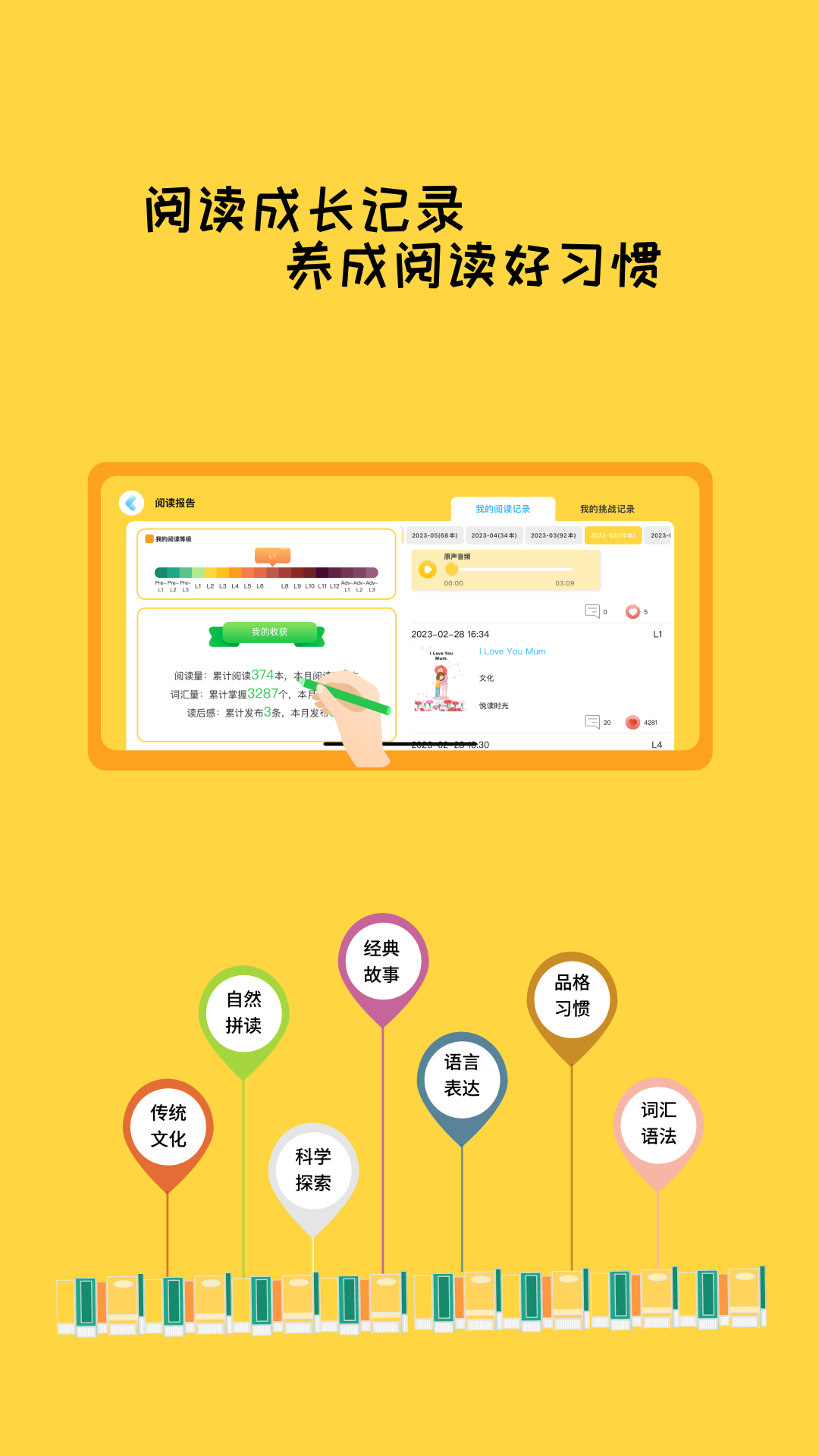 乔希家致力于帮助0 - 18岁的孩子培养阅读习惯,在这个过程中,着重通过听(磨耳朵)、说(借助音视频)、读(跟读测评)、写(留言互动)这几个方面,来提升孩子们的口语和写作能力。