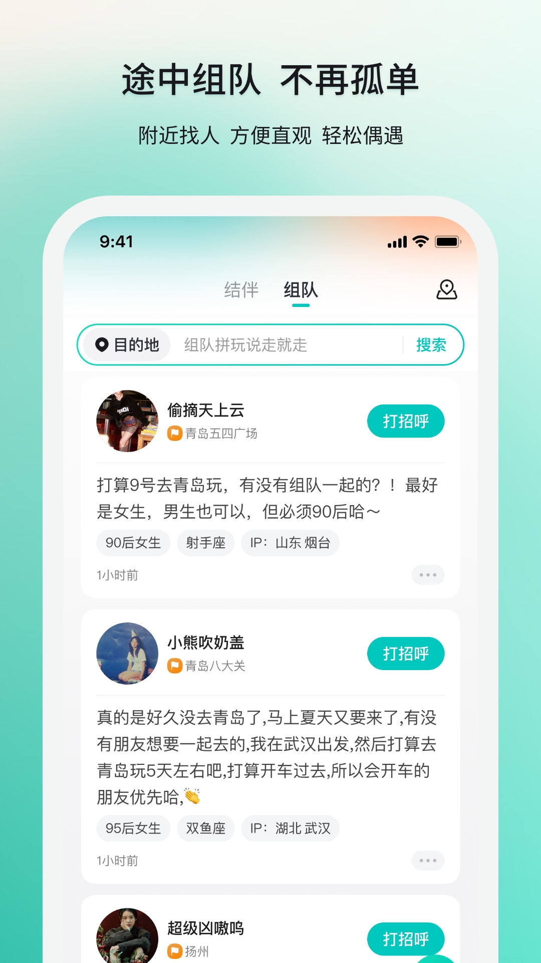 主要功能:途中结伴偶遇、发布圈子交流、获得出行服务、预订民宿酒店、优选旅游线路等。